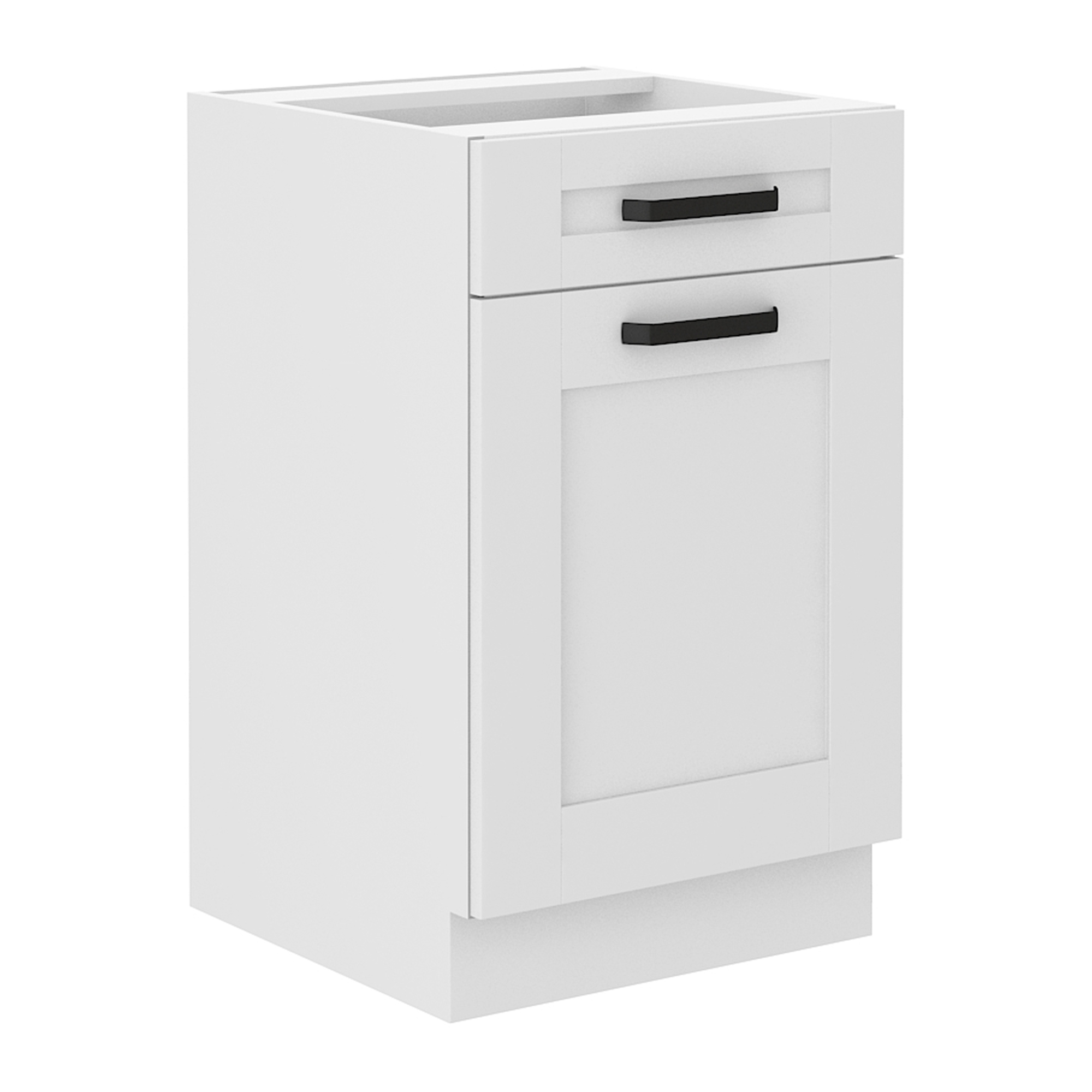 Spodní skříňka LULA 50 D 1F 1S BB Materiál: laminovaná DTD Barva: bílá Rozměry (ŠxHxV): 50x52x82 cm Tloušťka materiálu: 1,6 cm 1 šuplík S dvířky S policí S kovovou úchytkou Barva úchytky: černá S dolní lištou/soklem Bez pracovní desky Šuplík typu SMART BOX s ocelovými bočnicemi Moderní dynamický design Dodáváno v demontu Možnost dokoupit univerzální dřez LAY ON Spodní skříňky jsou dodávány včetně dolní lišty, bez pracovní desky. Možnost dokoupení pracovní desky dub artisan v ceně 1.890 Kč/bm.nebo marmur roma v ceně 1.790 Kč/bm. Možnost dokoupit univerzální dřez LAY ON.