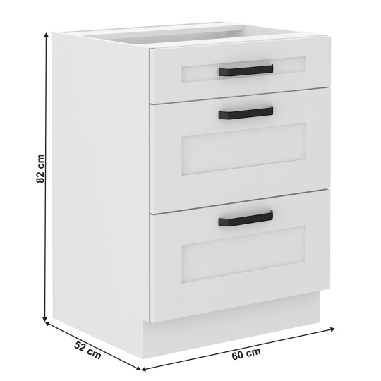Spodní skříňka LULA 60 D 3S BB Materiál: laminovaná DTD Barva: bílá Rozměry (ŠxHxV): 60x52x82 cm Tloušťka materiálu: 1,6 cm Šuplíková 3 šuplíky S kovovou úchytkou Barva úchytky: černá S dolní lištou/soklem Bez pracovní desky Moderní dynamický design Dodáváno v demontu Možnost dokoupit univerzální dřez LAY ON Spodní skříňky jsou dodávány včetně dolní lišty, bez pracovní desky. Možnost dokoupení pracovní desky dub artisan v ceně 1.890 Kč/bm.nebo marmur roma v ceně 1.790 Kč/bm. Možnost dokoupit univerzální dřez LAY ON.