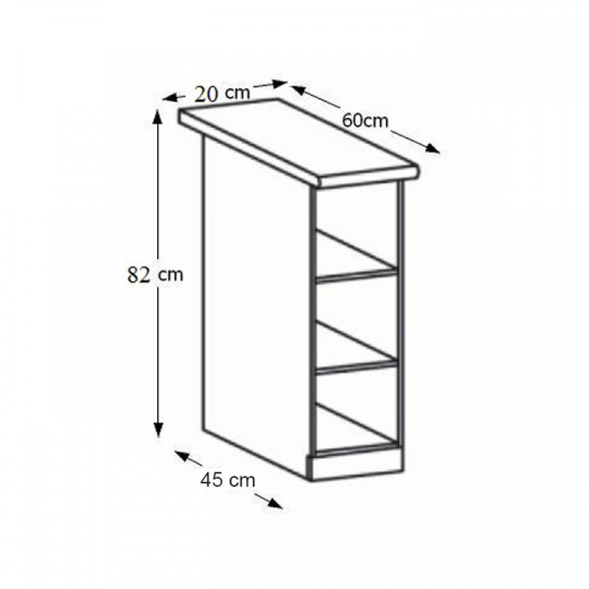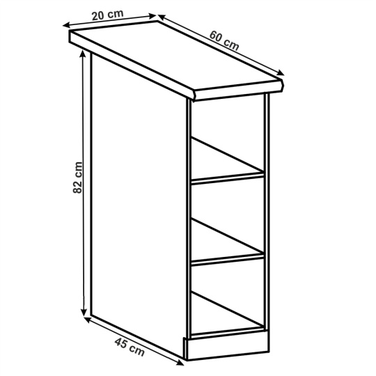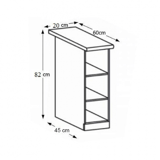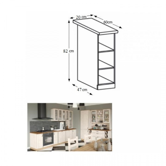 Spodní skříňka se dvěma policemi, ROYAL D20P Materiál: korpus je vyroben z kvalitní laminované dřevotřísky Barva: bílá Rozměry ŠxHxV: 20x45 / 60x82 cm Tloušťka materiálu: 15 mm Dodávané v demontu. Spodní skříňky ke kuchyni ROYAL jsou dodávány bez pracovní desky a bez soklu. Pracovní desku Dub Porterhouse tmavý lze doobjednat v tloušťce 3,8 cm v ceně 1690 Kč/1 bm. Ke každé dolní skříňce, kromě rohových skříněk D25PZ, je třeba doobjednat i sokel v provedení dub divoký v ceně 280 Kč/1 bm a 2 kusy úchytů na sokl v ceně 30 Kč/2 ks. Ke spodním skříňkám máte možnost dokoupit také ukončení na sokl o hloubce 47 cm a 56 cm za 140 Kč. Objednávku vepište do poznámky v objednávkovém formuláři.