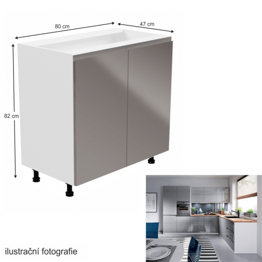 Spodní skříňka, Aurora D80 Provedení: DTD laminové / MDF Barva: bílá / šedá extra vysoký lesk Rozměry (ŠxHxV): 80x47x82 cm Tloušťka materiálu: 15 mm Systém tichého zavírání dvířek Pracovní deska není součástí skříněk. Je možné si doobjednat pracovní desku v provedení dub artisan o tloušťce 38 mm za 1.690 Kč/bm. Možnost dokoupit dřez, dřezovou baterii a příslušenství. Ke spodním skříňkám máte možnost dokoupit spodní lištu/sokl v bílé barvě o rozměru 1 bm za 210 Kč nebo 2 bm za 420 Kč a ukončení na sokl o hloubce 47 cm nebo 58 cm za 140 Kč. Ke každé dolní skříňce, kromě D25PZ, je třeba doobjednat 2 ks úchytek na sokl - cena 30 Kč/2ks.
