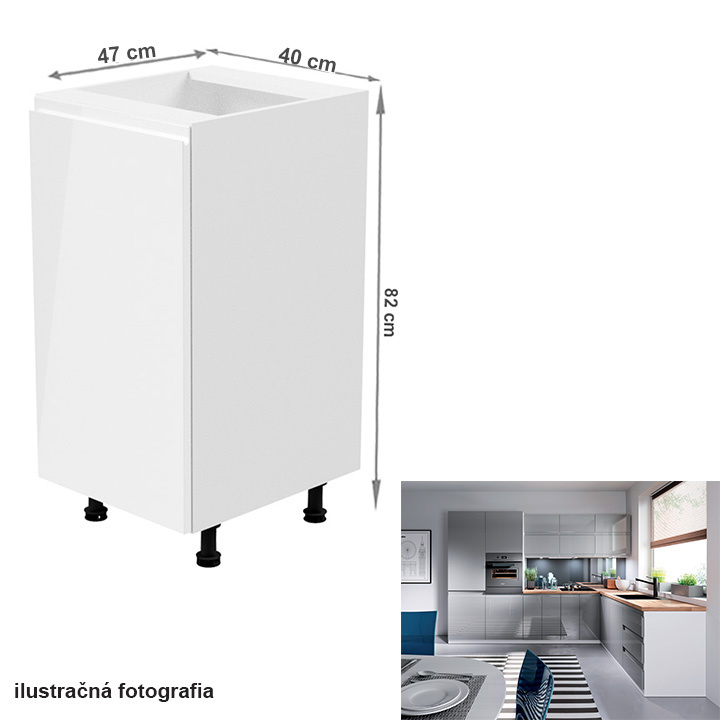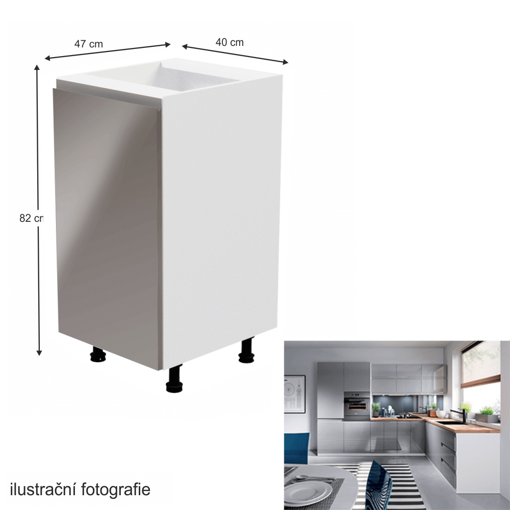 Spodní skříňka, Aurora D40 Provedení: DTD laminové / MDF Barva: bílá / šedá extra vysoký lesk Rozměry (ŠxHxV): 40x47x82 cm Tloušťka materiálu: 15 mm Systém tichého zavírání dvířek Pracovní deska není součástí skříněk. Je možné si doobjednat pracovní desku v provedení dub artisan o tloušťce 38 mm za 1.890 Kč/bm. Možnost dokoupit dřez, dřezovou baterii a příslušenství. Ke spodním skříňkám máte možnost dokoupit spodní lištu/sokl v bílé barvě o rozměru 1 bm za 280 Kč nebo 2 bm za 560 Kč a ukončení na sokl o hloubce 47 cm nebo 58 cm za 210 Kč. Ke každé dolní skříňce, kromě D25PZ, je třeba doobjednat 2 ks úchytek na sokl - cena 40 Kč/2ks.