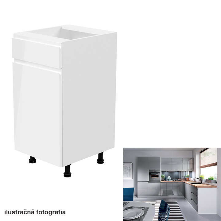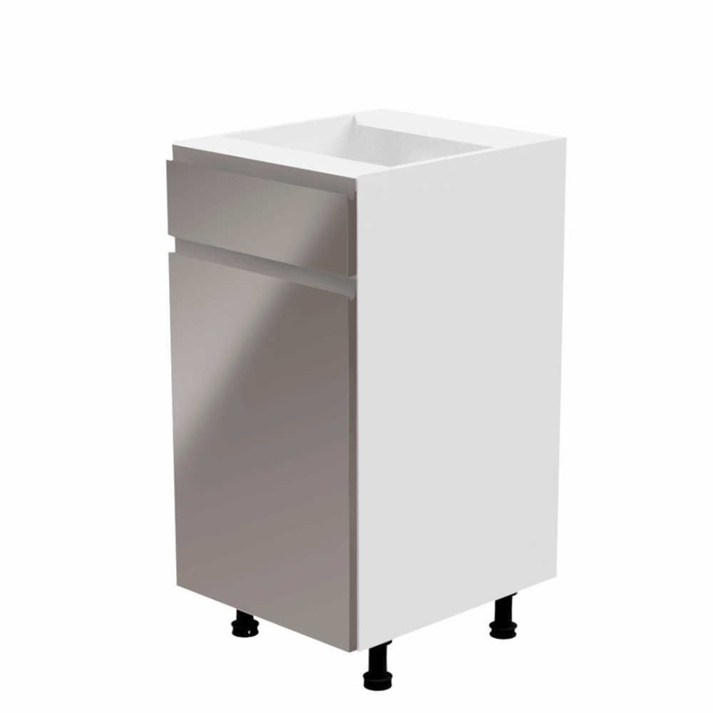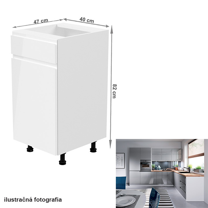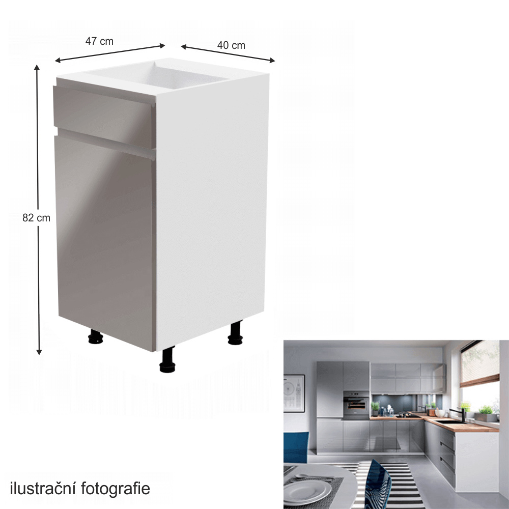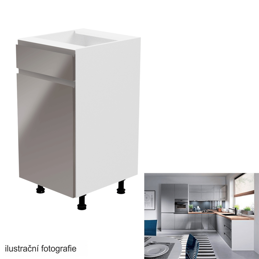 Spodní skříňka, Aurora D40S1 Provedení: DTD laminové / MDF Barva: bílá / šedá extra vysoký lesk Rozměry (ŠxHxV): 40x47x82 cm Tloušťka materiálu: 15 mm Systém tichého zavírání dvířek Pracovní deska není součástí skříněk. Je možné si doobjednat pracovní desku v provedení dub artisan o tloušťce 38 mm za 1.890 Kč/bm. Možnost dokoupit dřez, dřezovou baterii a příslušenství. Ke spodním skříňkám máte možnost dokoupit spodní lištu/sokl v bílé barvě o rozměru 1 bm za 280 Kč nebo 2 bm za 560 Kč a ukončení na sokl o hloubce 47 cm nebo 58 cm za 210 Kč. Ke každé dolní skříňce, kromě D25PZ, je třeba doobjednat 2 ks úchytek na sokl - cena 40 Kč/2ks.