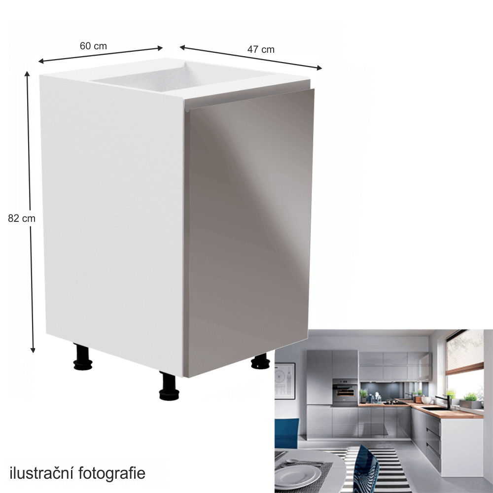 Spodní skříňka, Aurora D601F Provedení: DTD laminové / MDF Barva: bílá / šedá extra vysoký lesk Rozměry (ŠxHxV): 60x47x82 cm Tloušťka materiálu: 15 mm Systém tichého zavírání dvířek Pracovní deska není součástí skříněk. Je možné si doobjednat pracovní desku v provedení dub artisan o tloušťce 38 mm za 1.890 Kč/bm. Možnost dokoupit dřez, dřezovou baterii a příslušenství. Ke spodním skříňkám máte možnost dokoupit spodní lištu/sokl v bílé barvě o rozměru 1 bm za 280 Kč nebo 2 bm za 560 Kč a ukončení na sokl o hloubce 47 cm nebo 58 cm za 210 Kč. Ke každé dolní skříňce, kromě D25PZ, je třeba doobjednat 2 ks úchytek na sokl - cena 40 Kč/2ks.