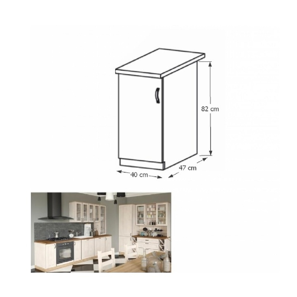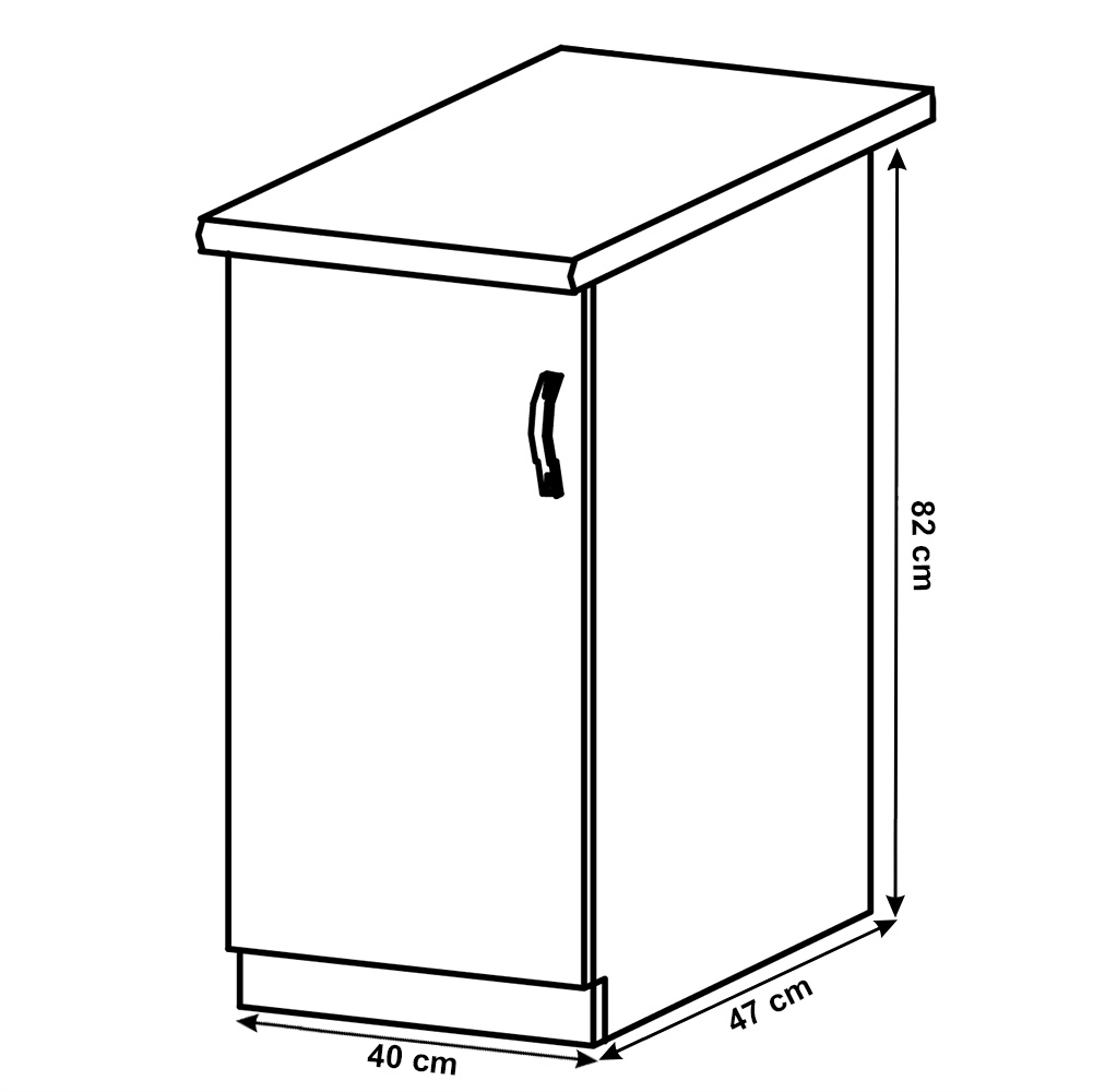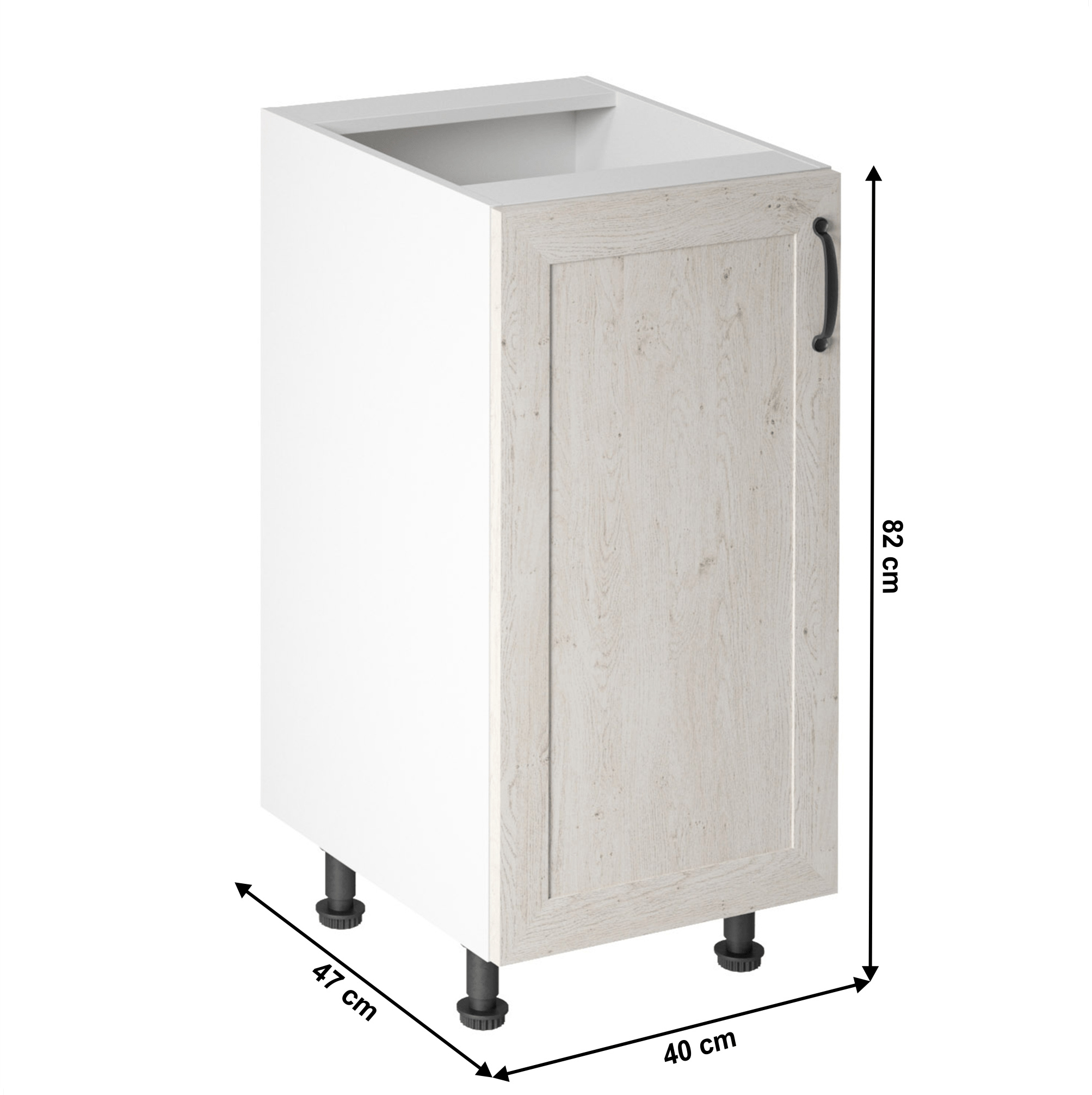 Spodní skříňka s dvířky s policou, levá, ROYAL D40 Materiál: korpus je vyroben z kvalitní laminované dřevotřísky Barva: bílá/sosna skandinávska Rozměry ŠxHxV: 40x47 / 60x82 cm Tloušťka materiálu: 15 mm Systém tichého zavírání dvířek Dodávané v demontu. Spodní skříňky ke kuchyni ROYAL jsou dodávány bez pracovní desky a bez soklu. Pracovní desku Dub Porterhouse tmavý lze doobjednat v tloušťce 3,8 cm v ceně 1690 Kč/1 bm. Ke každé dolní skříňce, kromě rohových skříněk D25PZ, je třeba doobjednat i sokel v provedení dub divoký v ceně 270 Kč/1 bm a 2 kusy úchytů na sokl v ceně 30 Kč/2 ks. Ke spodním skříňkám máte možnost dokoupit také ukončení na sokl o hloubce 47 cm a 56 cm za 210 Kč. Objednávku vepište do poznámky v objednávkovém formuláři.