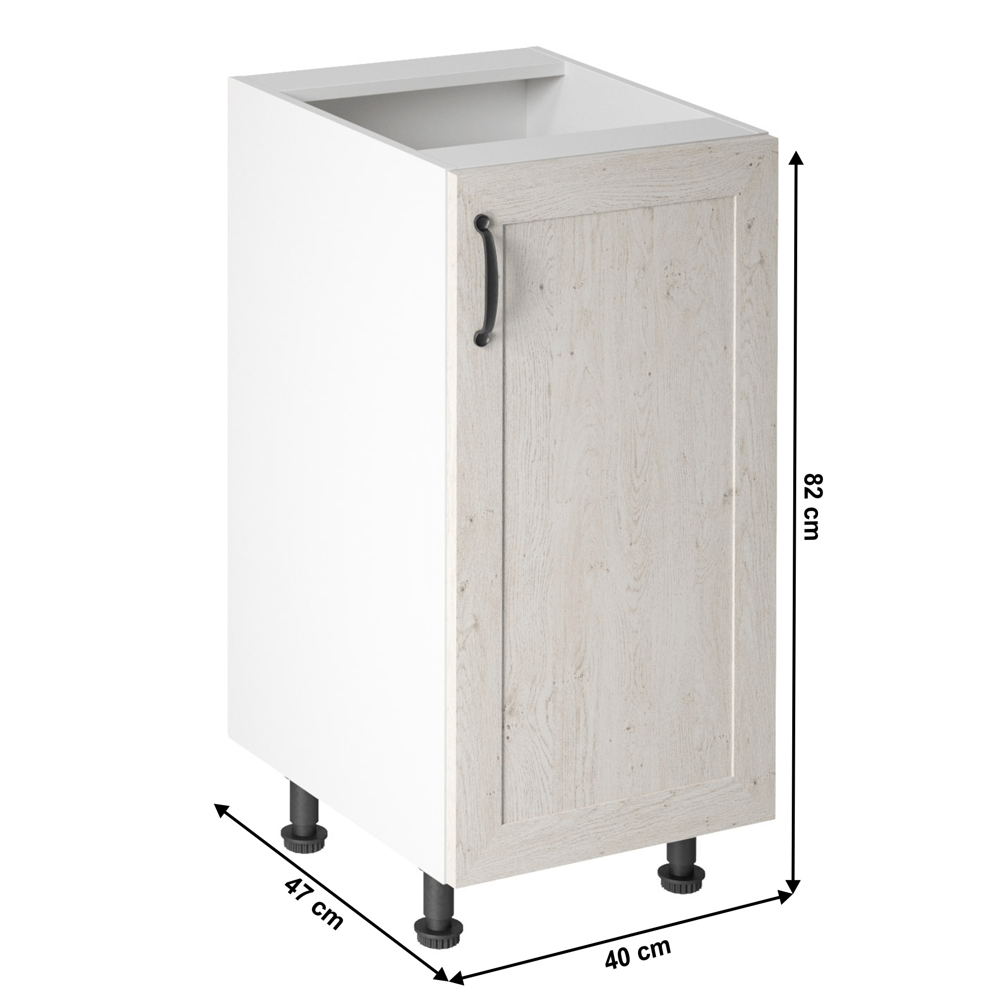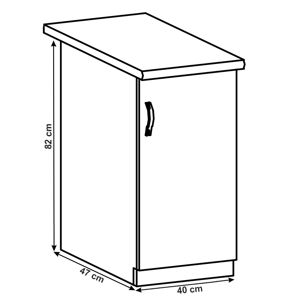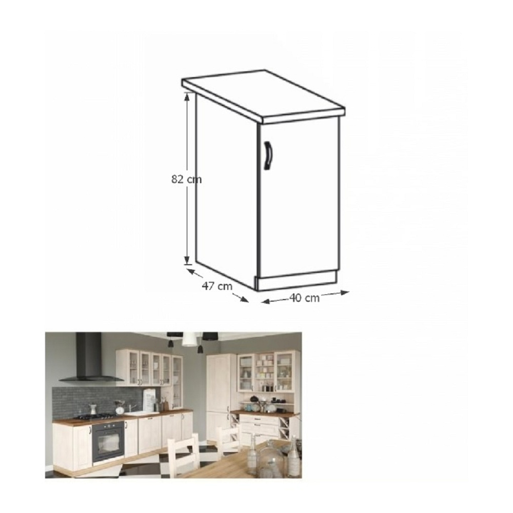 Spodní skříňka s dvířky s policou, pravá, ROYAL D40 Materiál: korpus je vyroben z kvalitní laminované dřevotřísky Barva: bílá/sosna skandinávska Rozměry ŠxHxV: 40x47 / 60x82 cm Tloušťka materiálu: 15 mm Systém tichého zavírání dvířek Dodávané v demontu. Spodní skříňky ke kuchyni ROYAL jsou dodávány bez pracovní desky a bez soklu. Pracovní desku Dub Porterhouse tmavý lze doobjednat v tloušťce 3,8 cm v ceně 1690 Kč/1 bm. Ke každé dolní skříňce, kromě rohových skříněk D25PZ, je třeba doobjednat i sokel v provedení dub divoký v ceně 270 Kč/1 bm a 2 kusy úchytů na sokl v ceně 30 Kč/2 ks. Ke spodním skříňkám máte možnost dokoupit také ukončení na sokl o hloubce 47 cm a 56 cm za 210 Kč. Objednávku vepište do poznámky v objednávkovém formuláři.