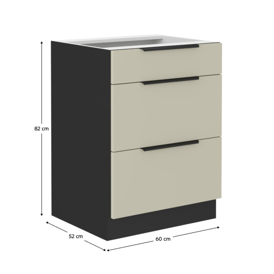 Materiál: laminovaná DTD Barva dvířek: cashmere/kašmír Barva korpus: černý mat Rozměry (ŠxHxV): 60x52x82 cm Tloušťka materiálu: 1,6 cm Šuplíková 3 šuplíky S úchytkou Barva úchytky: aluminiová Bez pracovní desky S dolní lištou/soklem Bez pracovní desky Moderní design Tichý doraz zásuvek Šuplík typu PREMIUM-BOX s ocelovými bočnicemi Možnost dokoupit univerzální dřez LAY ON Dodáváno v demontu Spodní sektorové skříňky jsou dodávány včetně dolní lišty (sokla), bez pracovní desky. Pracovní desku o tloušťce 3,8 cm si můžete doobjednat v provedení marmur roma za cenu 1.650 Kč/bm.