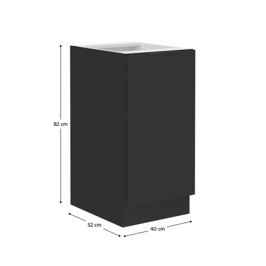 Materiál: laminovaná DTD Barva dvířek: černá Barva korpus: černý mat Rozměry (ŠxHxV): 40x52x82 cm Tloušťka materiálu: 1,6 cm S dvířky Policová S úchytkou Barva úchytky: aluminiová Bez pracovní desky S dolní lištou/soklem Systém tichého zavírání dvířek Moderní design Možnost dokoupit univerzální dřez LAY ON Dodáváno v demontu Spodní sektorové skříňky jsou dodávány včetně dolní lišty (sokla), bez pracovní desky. Pracovní desku o tloušťce 3,8 cm si můžete doobjednat v provedení marmur roma za cenu 1.650 Kč/bm