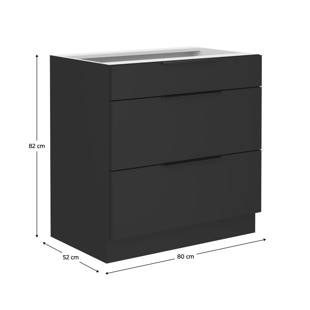Materiál: laminovaná DTD Barva dvířek: černá Barva korpus: černý mat Rozměry (ŠxHxV): 80x52x82 cm Tloušťka materiálu: 1,6 cm 3 šuplíky S úchytkou Barva úchytky: aluminiová Bez pracovní desky S dolní lištou/soklem Systém tichého dorazu zásuvek Šuplík typu PREMIUM BOX s ocelovými bočnicemi Moderní design Možnost dokoupit univerzální dřez LAY ON Dodáváno v demontu Spodní sektorové skříňky jsou dodávány včetně dolní lišty (sokla), bez pracovní desky. Pracovní desku o tloušťce 3,8 cm si můžete doobjednat v provedení marmur roma za cenu 1.650 Kč/bm