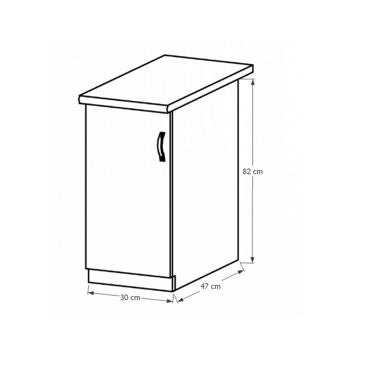 Spodní skříňka D30 s dvířky, levá ke kuchyni SICILIA Provedení: DTD laminovaná/MDF lišty Barva: bíla/sosna Andersen Rozměry (ŠxHxV): 30x47x82 cm Tloušťka materiálu: 15 mm Spodní skříňky jsou dodávány bez pracovní desky. Můžete si objednat pracovní desku royal beigemarble k provedení ořech Milano - tloušťka 28mm za 1.590 Kč/bm a nebo pracovní desku dub Lancelot k provedení sosna andersen - tloušťka 38 mm za 1.690 Kč/bm.