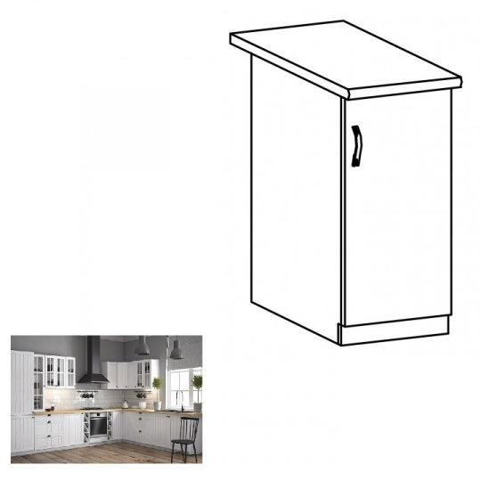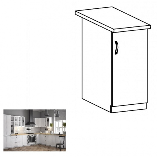 Spodní skříňka s dvířky a policí, pravá, ke kuchyni PROVANCE Provedení: DTD laminovaná / MDF Barva: bílá / sosna andersen Rozměry (ŠxHxV): 30x47x82 cm Tloušťka materiálu: 15 mm Systém tichého zavírání dvířek Spodní skříňky jsou dodávány bez pracovní desky. Pracovní deska v tloušťce 3 cm. Ke spodním skříňkám je třeba doobjednat sokl. Ke každé spodní skříňce, kromě dřezové D25PZ, je třeba doobjednat ještě 2 kusy úchytů na sokl. Cena za pracovní desku dub lancelot je 1.690, - Kč za bm- tloušťka je 38 mm, cena za spodní lištu je 390, - Kč za bm. Cena ukončení na sokl s hloubkou 47 cm nebo 58 cm je 140 Kč. Ke každé dolní skříňce, kromě D25PZ, je třeba doobjednat 2 ks úchytek na sokl - cena 30, - Kč / 2Ks.