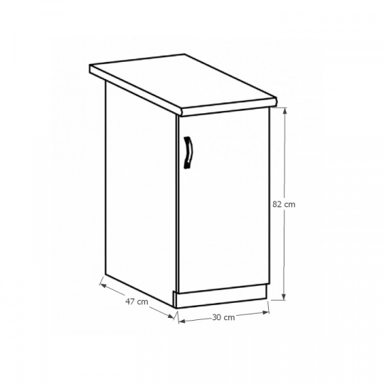 Spodní skříňka D30 s dvířky, pravá ke kuchyni SICILIA Provedení: DTD laminovaná/MDF lišty Barva: bíla/sosna Andersen Rozměry (ŠxHxV): 30x47x82 cm Tloušťka materiálu: 15 mm Spodní skříňky jsou dodávány bez pracovní desky. Můžete si objednat pracovní desku royal beigemarble k provedení ořech Milano - tloušťka 28mm za 1.590 Kč/bm a nebo pracovní desku dub Lancelot k provedení sosna andersen - tloušťka 38 mm za 1.690 Kč/bm.