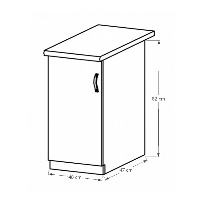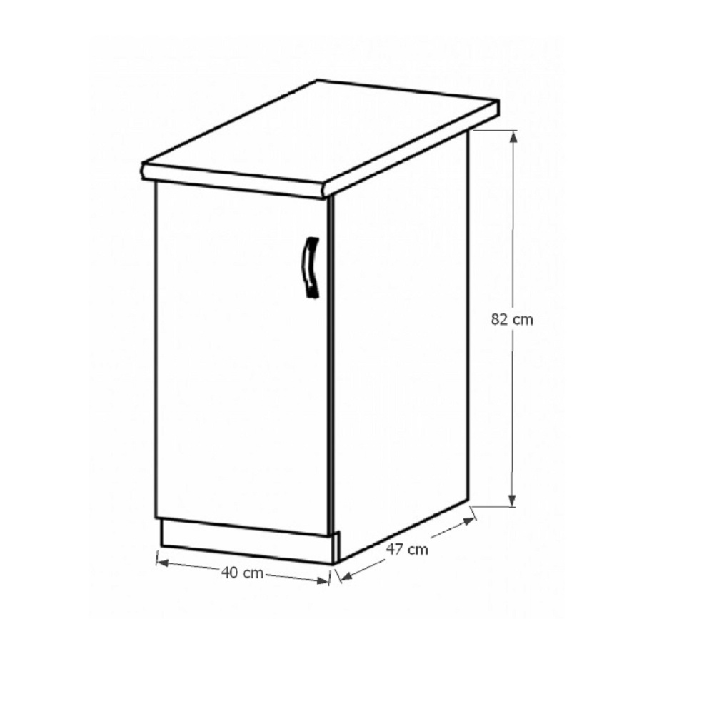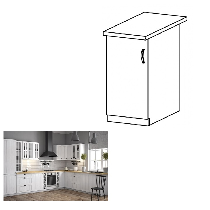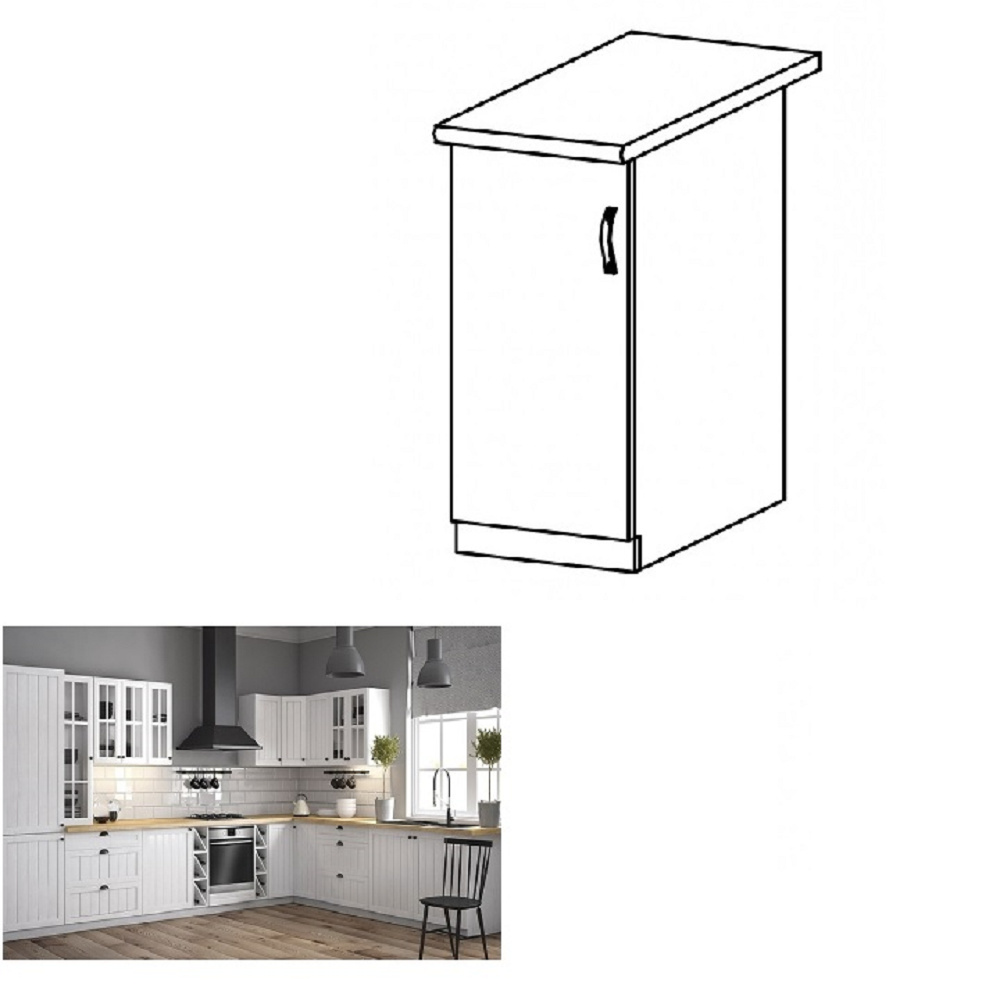 Spodní skříňka s dvířky a policí, levá, ke kuchyni PROVANCE Provedení: DTD laminovaná / MDF Barva: bílá / sosna andersen Rozměry (ŠxHxV): 40x47x82 cm Tloušťka materiálu: 15 mm Systém tichého zavírání dvířek Spodní skříňky jsou dodávány bez pracovní desky. Pracovní deska v tloušťce 3 cm. Ke spodním skříňkám je třeba doobjednat sokl. Ke každé spodní skříňce, kromě dřezové D25PZ, je třeba doobjednat ještě 2 kusy úchytů na sokl. Cena za pracovní desku dub lancelot je 1.890, - Kč za bm- tloušťka je 38 mm, cena za spodní lištu je 390, - Kč za bm. Cena ukončení na sokl s hloubkou 47 cm nebo 58 cm je 210 Kč. Ke každé dolní skříňce, kromě D25PZ, je třeba doobjednat 2 ks úchytek na sokl - cena 40, - Kč / 2Ks.
