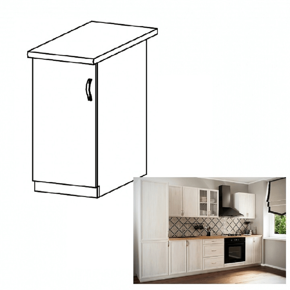Spodní skříňka D40 s dvířky, levá ke kuchyni SICILIA Provedení: DTD laminovaná/MDF lišty Barva: bíla/sosna Andersen Rozměry (ŠxHxV): 40x47x82 cm Tloušťka materiálu: 15 mm Spodní skříňky jsou dodávány bez pracovní desky. Můžete si objednat pracovní desku royal beigemarble k provedení ořech Milano - tloušťka 28mm za 1.590 Kč/bm a nebo pracovní desku dub Lancelot k provedení sosna andersen - tloušťka 38 mm za 1.690 Kč/bm.