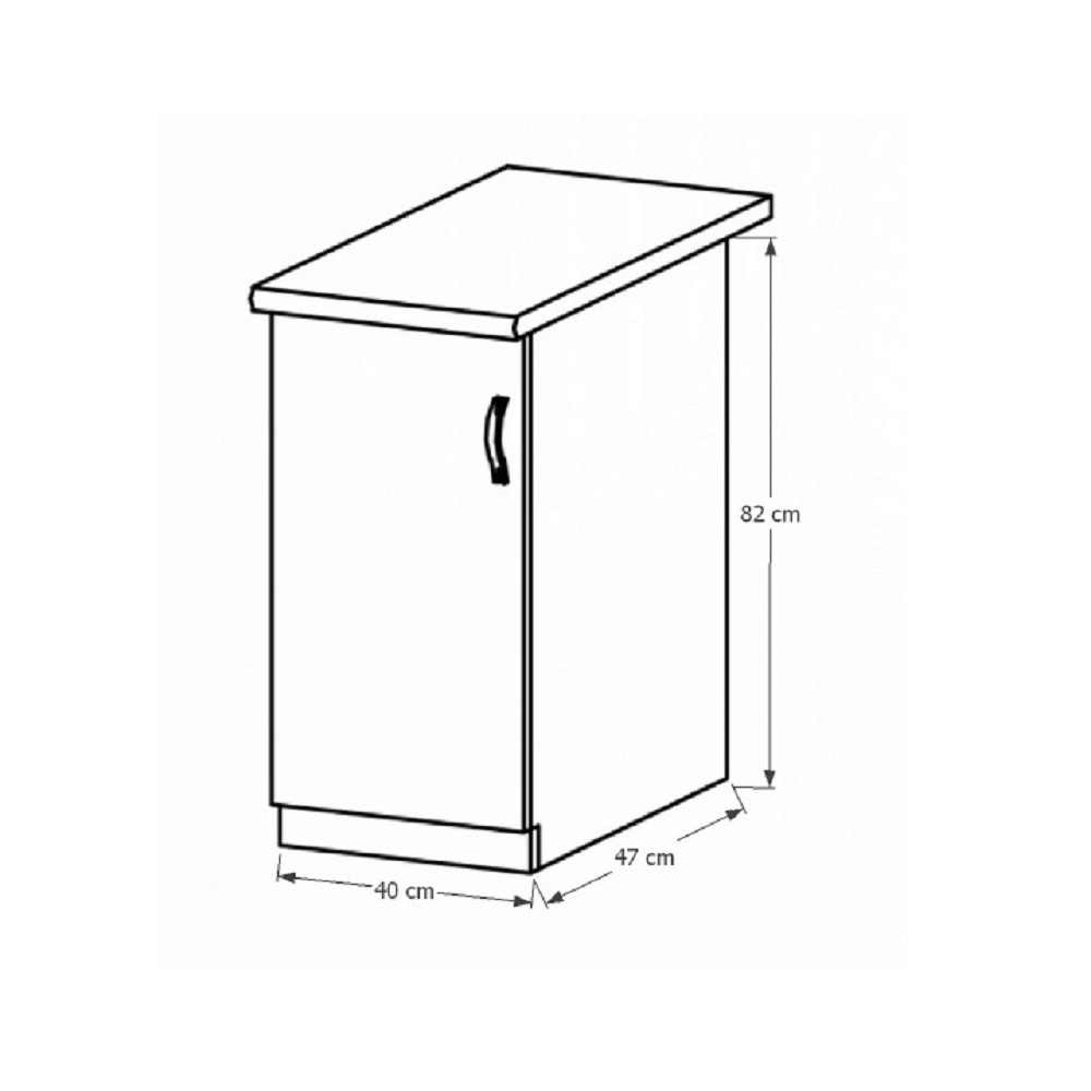 Spodní skříňka D40 s dvířky, levá ke kuchyni SICILIA Provedení: DTD laminovaná/MDF lišty Barva: ořech Milano Rozměry (ŠxHxV): 40x47x82 cm Tloušťka materiálu: 15 mm Spodní skříňky jsou dodávány bez pracovní desky. Můžete si objednat pracovní desku royal beigemarble k provedení ořech Milano - tloušťka 28mm za 1.790 Kč/bm a nebo pracovní desku dub Lancelot k provedení sosna andersen - tloušťka 38 mm za 1.890 Kč/bm.