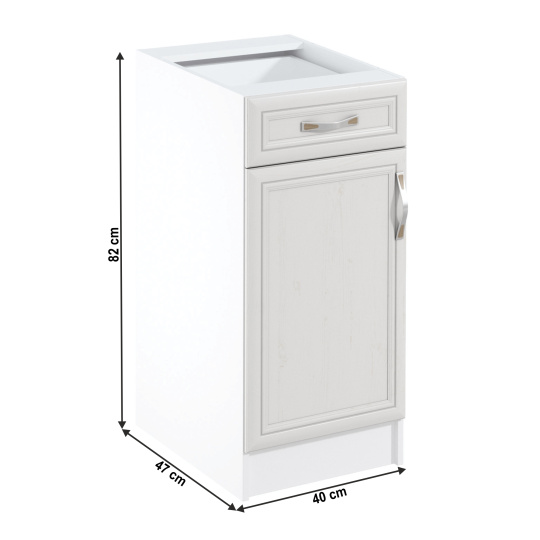 Spodní skříňka D40S1 se šuplíkem a s dvířky, levá ke kuchyni SICILIA Provedení: DTD laminovaná/MDF lišty Barva: bíla/sosna Andersen Rozměry (ŠxHxV): 40x47x82 cm Tloušťka materiálu: 15 mm Spodní skříňky jsou dodávány bez pracovní desky. Můžete si objednat pracovní desku royal beigemarble k provedení ořech Milano - tloušťka 28mm za 1.590 Kč/bm a nebo pracovní desku dub Lancelot k provedení sosna andersen - tloušťka 38 mm za 1.690 Kč/bm.
