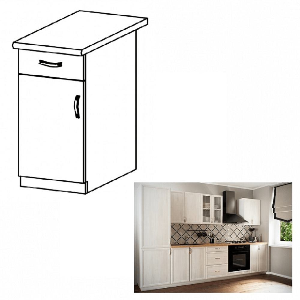 Spodní skříňka D40S1 se šuplíkem a s dvířky, levá ke kuchyni SICILIA Provedení: DTD laminovaná/MDF lišty Barva: bíla/sosna Andersen Rozměry (ŠxHxV): 40x47x82 cm Tloušťka materiálu: 15 mm Spodní skříňky jsou dodávány bez pracovní desky. Můžete si objednat pracovní desku royal beigemarble k provedení ořech Milano - tloušťka 28mm za 1.590 Kč/bm a nebo pracovní desku dub Lancelot k provedení sosna andersen - tloušťka 38 mm za 1.690 Kč/bm.