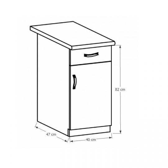 Spodní skříňka D40S1 se šuplíkem a s dvířky, pravá ke kuchyni SICILIA Provedení: DTD laminovaná/MDF lišty Barva: ořech Milano Rozměry (ŠxHxV): 40x47x82 cm Tloušťka materiálu: 15 mm Spodní skříňky jsou dodávány bez pracovní desky. Můžete si objednat pracovní desku royal beigemarble k provedení ořech Milano - tloušťka 28mm za 1.590 Kč/bm a nebo pracovní desku dub Lancelot k provedení sosna andersen - tloušťka 38 mm za 1.690 Kč/bm.