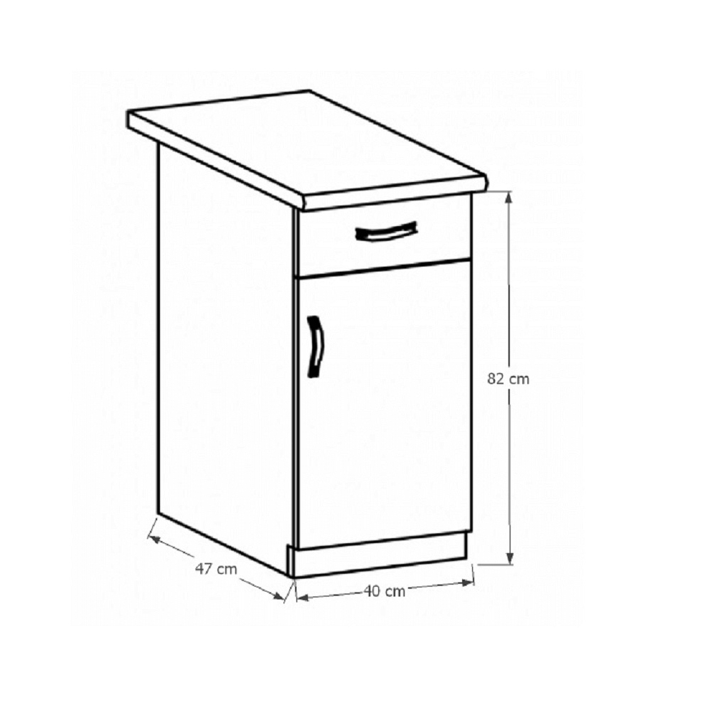 Spodní skříňka D40S1 se šuplíkem a s dvířky, pravá ke kuchyni SICILIA Provedení: DTD laminovaná/MDF lišty Barva: ořech Milano Rozměry (ŠxHxV): 40x47x82 cm Tloušťka materiálu: 15 mm Spodní skříňky jsou dodávány bez pracovní desky. Můžete si objednat pracovní desku royal beigemarble k provedení ořech Milano - tloušťka 28mm za 1.790 Kč/bm a nebo pracovní desku dub Lancelot k provedení sosna andersen - tloušťka 38 mm za 1.890 Kč/bm.