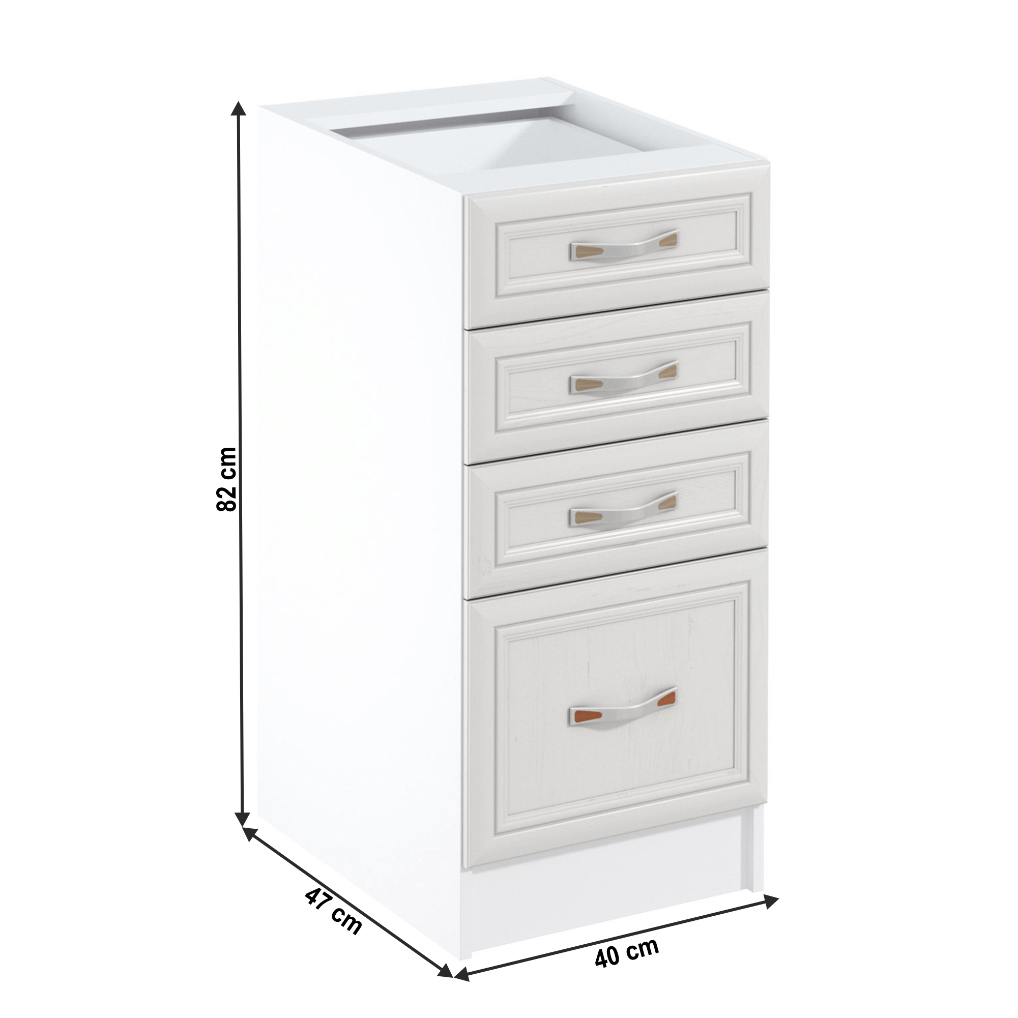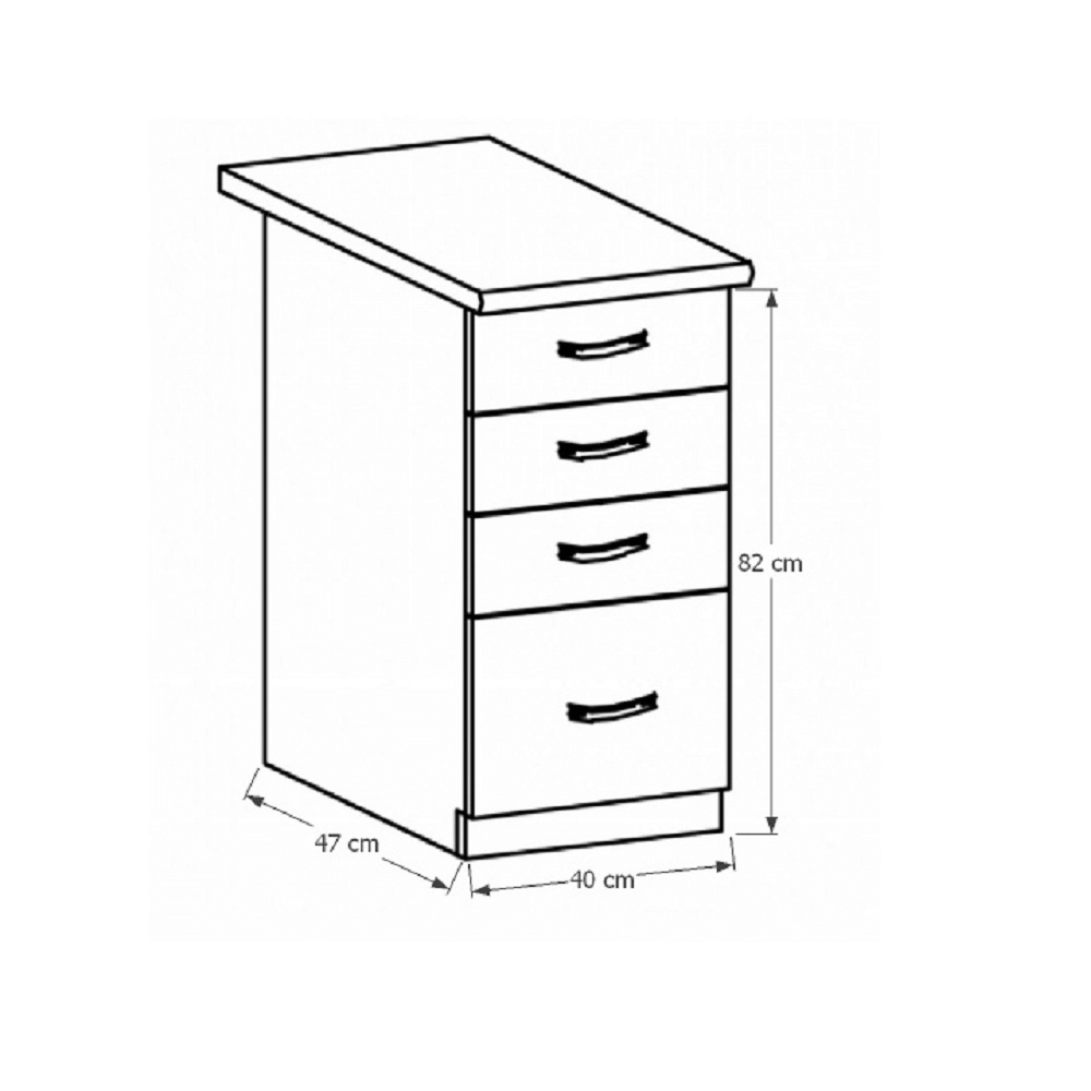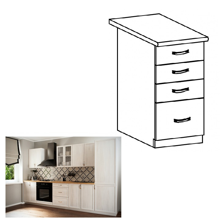 Spodní skříňka D40S4 s šuplíky ke kuchyni SICILIA Provedení: DTD laminovaná/MDF lišty Barva: bíla/sosna Andersen Rozměry (ŠxHxV): 40x47x82 cm Tloušťka materiálu: 15 mm Spodní skříňky jsou dodávány bez pracovní desky. Můžete si objednat pracovní desku royal beigemarble k provedení ořech Milano - tloušťka 28mm za 1.590 Kč/bm a nebo pracovní desku dub Lancelot k provedení sosna andersen - tloušťka 38 mm za 1.690 Kč/bm.