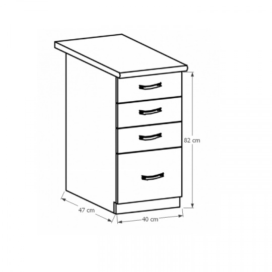 Spodní skříňka D40S4 s šuplíky ke kuchyni SICILIA Provedení: DTD laminovaná/MDF lišty Barva: ořech Milano Rozměry (ŠxHxV): 40x47x82 cm Tloušťka materiálu: 15 mm Spodní skříňky jsou dodávány bez pracovní desky. Můžete si objednat pracovní desku royal beigemarble k provedení ořech Milano - tloušťka 28mm za 1.590 Kč/bm a nebo pracovní desku dub Lancelot k provedení sosna andersen - tloušťka 38 mm za 1.690 Kč/bm.