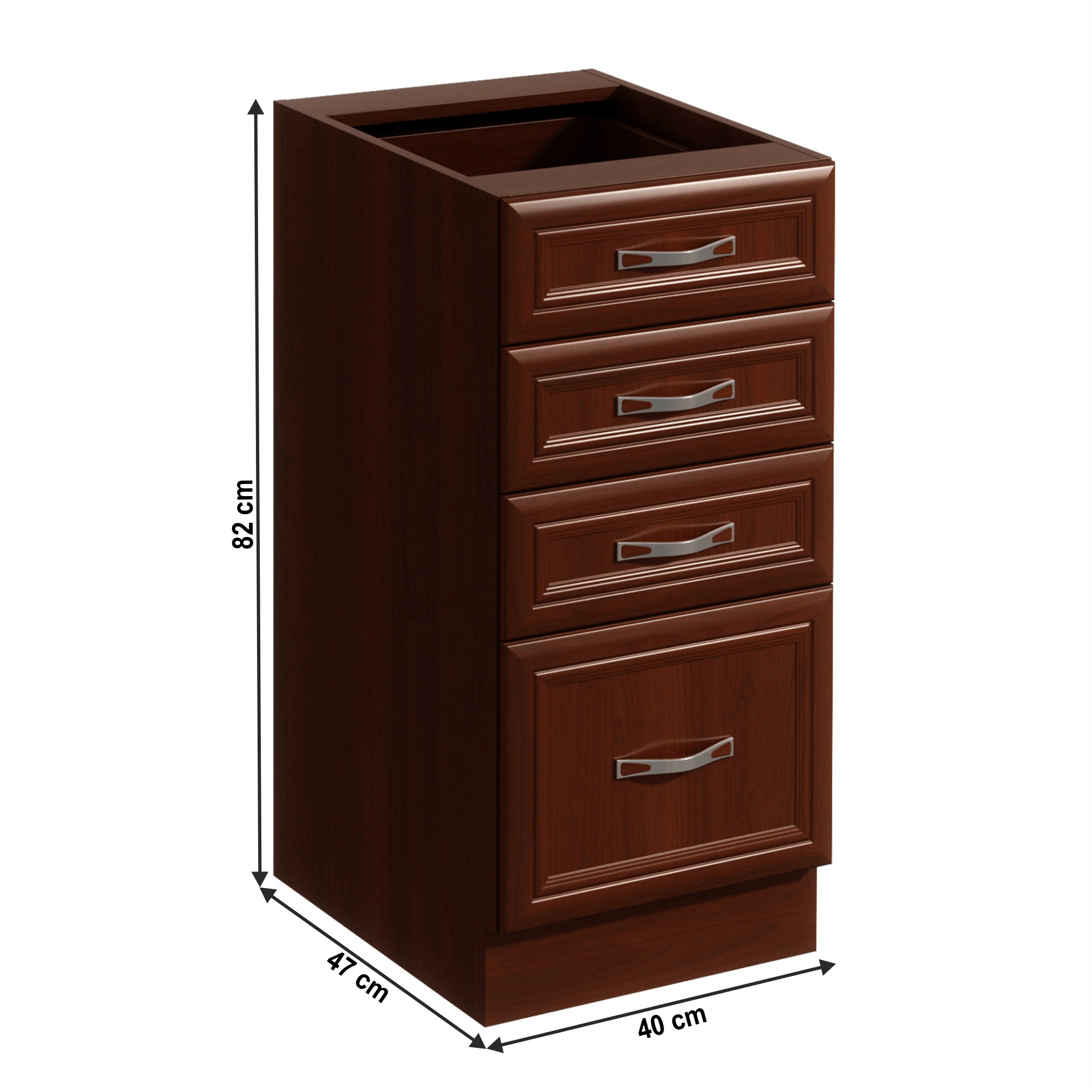 Spodní skříňka D40S4 s šuplíky ke kuchyni SICILIA Provedení: DTD laminovaná/MDF lišty Barva: ořech Milano Rozměry (ŠxHxV): 40x47x82 cm Tloušťka materiálu: 15 mm Spodní skříňky jsou dodávány bez pracovní desky. Můžete si objednat pracovní desku royal beigemarble k provedení ořech Milano - tloušťka 28mm za 1.790 Kč/bm a nebo pracovní desku dub Lancelot k provedení sosna andersen - tloušťka 38 mm za 1.890 Kč/bm.