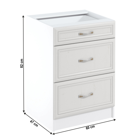 Spodní skříňka D60S3 s šuplíky ke kuchyni SICILIA Provedení: DTD laminovaná/MDF lišty Barva: bíla/sosna Andersen Rozměry (ŠxHxV): 60x47x82 cm Tloušťka materiálu: 15 mm Spodní skříňky jsou dodávány bez pracovní desky. Můžete si objednat pracovní desku royal beigemarble k provedení ořech Milano - tloušťka 28mm za 1.590 Kč/bm a nebo pracovní desku dub Lancelot k provedení sosna andersen - tloušťka 38 mm za 1.690 Kč/bm.