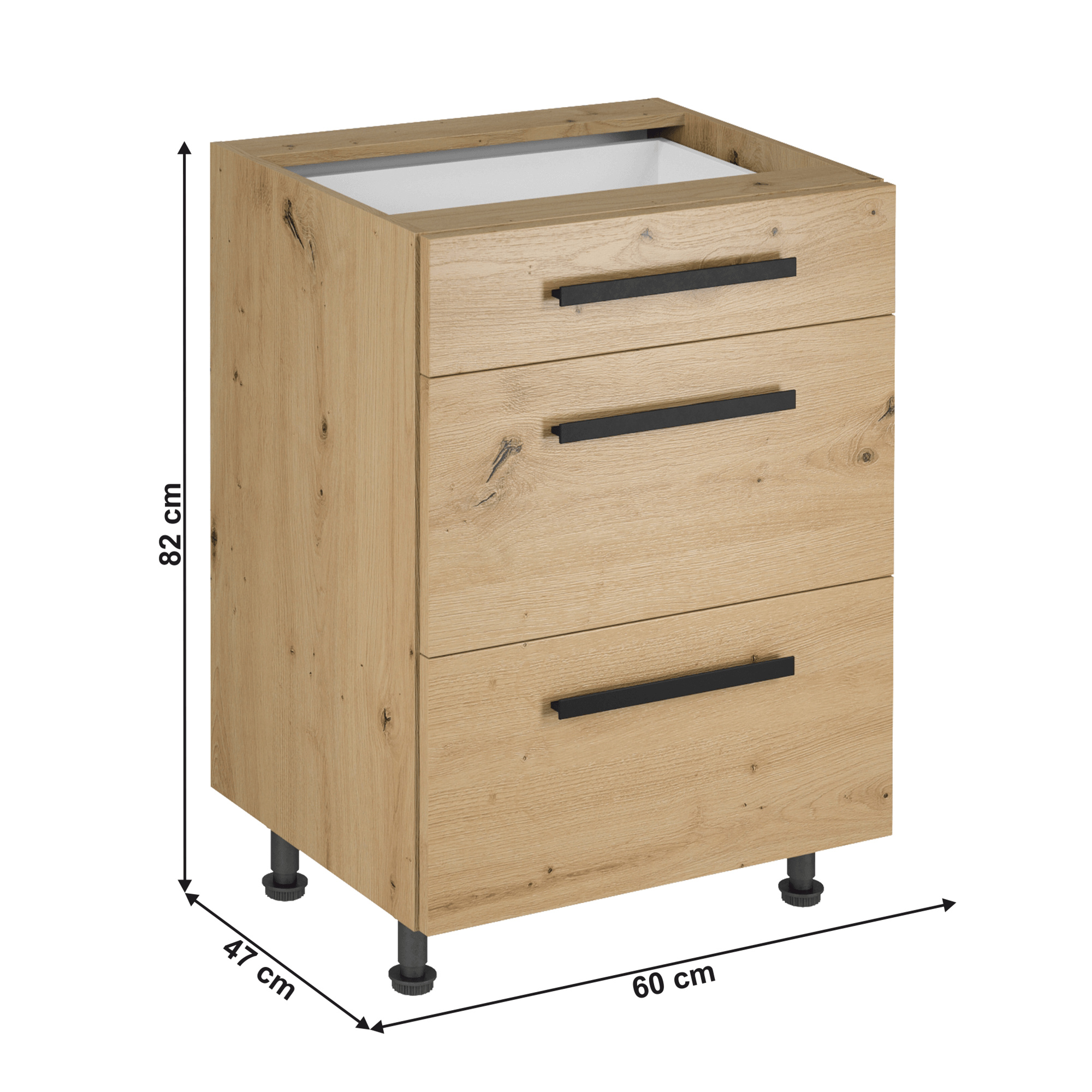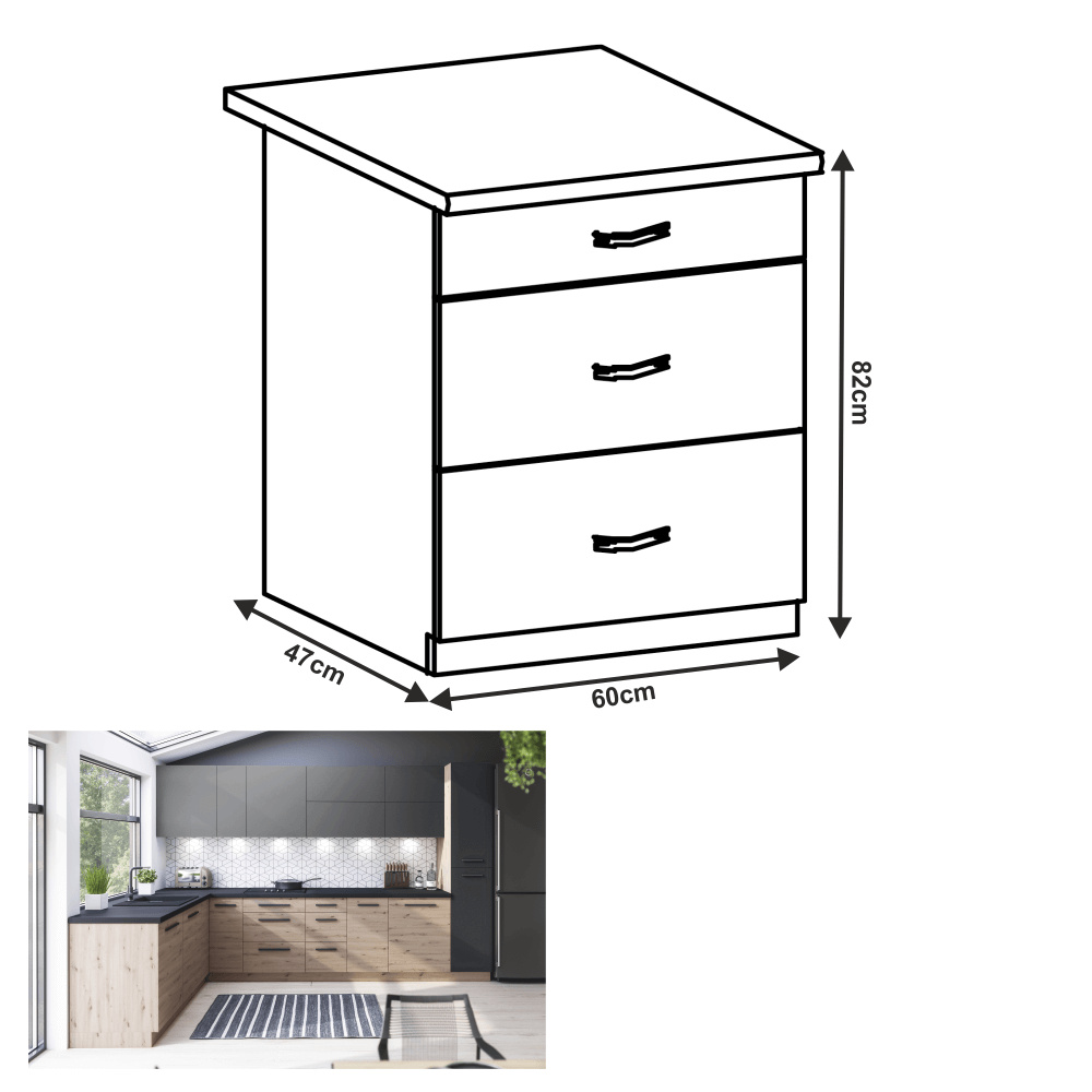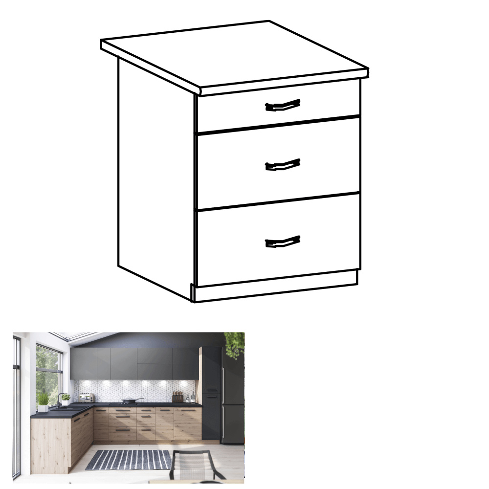 Materiál: DTD laminovaná Barva: dub artisan Rozměry (ŠxHxV): 60x47x82 cm Tloušťka materiálu dvířka (dub artisan): 1,5 cm Tloušťka materiálu dvířka (šedá MDF): 1,8 cm 3 šuplíky Otváranie pomocí úchytiek Bez pracovní desky Bez spodní lišty Dodávané v demontu Cena sektorových skříněk je uváděna bez pracovní desky a spodní lišty. Cena za pracovní desku dub artisan je 1.690 Kč / bm - tloušťka 38 mm, cena za pracovní desku černý vulkán je 1.990 Kč / bm - tloušťka 38 mm. Možnost dokoupení spodní lišty dub artisan v rozměru 1 m za cenu 280 Kč nebo v rozměru 2 m za cenu 560 Kč a ukončení na sokl o hloubce 47 cm nebo 58 cm za 140 Kč. Ke každé dolní skříňce je nutné doobjednat 2 ks úchytů na sokl cena 40 Kč / 2 ks. U skříněk D60S3 a D40S3 je třeba si vybrat skříňku s úchytkou nebo systémem Push Open.