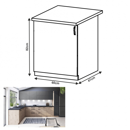 Materiál: DTD laminovaná Barva: dub artisan Rozměry (ŠxHxV): 60x47x82 cm Tloušťka materiálu dvířka (dub artisan): 1,5 cm Tloušťka materiálu dvířka (šedá MDF): 1,8 cm S policí Univerzální provedení Možnost volby otevírání PUSH OPEN Možnost volby otevírání úchytkami Bez pracovní desky Bez spodní lišty Dodáváno v demontu Cena sektorových skříněk je uváděna bez pracovní desky a spodní lišty. Cena za pracovní desku dub artisan je 1.690 Kč / bm - tloušťka 38 mm, cena za pracovní desku černý vulkán je 1.990 Kč / bm - tloušťka 38 mm. Možnost dokoupení spodní lišty dub artisan v rozměru 1 m za cenu 280 Kč nebo v rozměru 2 m za cenu 560 Kč a ukončení na sokl o hloubce 47 cm nebo 58 cm za 140 Kč. Ke každé dolní skříňce je nutné doobjednat 2 ks úchytů na sokl cena 40 Kč / 2 ks. U skříněk D60S3 a D40S3 je třeba si vybrat skříňku s úchytkou nebo systémem Push Open.