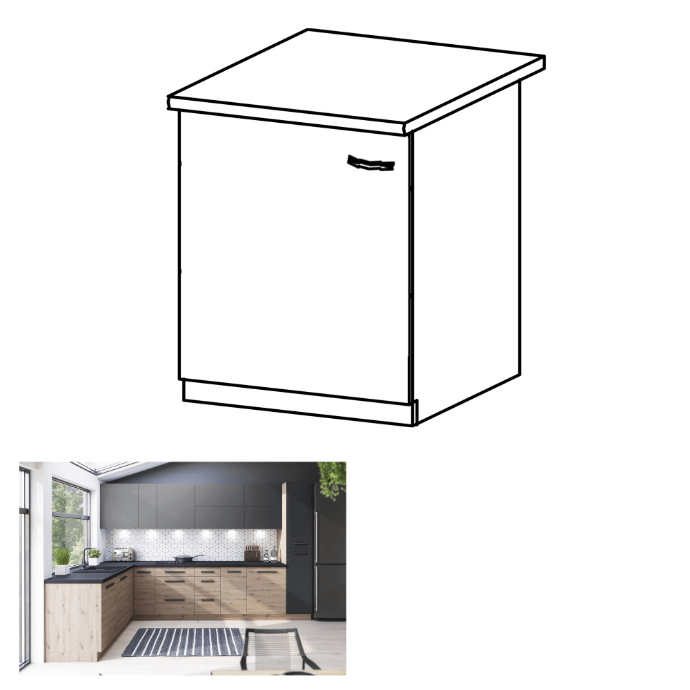 Materiál: DTD laminovaná Barva: dub artisan Rozměry (ŠxHxV): 60x47x82 cm Tloušťka materiálu dvířka (dub artisan): 1,5 cm Tloušťka materiálu dvířka (šedá MDF): 1,8 cm S policí Univerzální provedení Možnost volby otevírání PUSH OPEN Možnost volby otevírání úchytkami Bez pracovní desky Bez spodní lišty Dodáváno v demontu Cena sektorových skříněk je uváděna bez pracovní desky a spodní lišty. Cena za pracovní desku dub artisan je 1.690 Kč / bm - tloušťka 38 mm, cena za pracovní desku černý vulkán je 1.990 Kč / bm - tloušťka 38 mm. Možnost dokoupení spodní lišty dub artisan v rozměru 1 m za cenu 280 Kč nebo v rozměru 2 m za cenu 560 Kč a ukončení na sokl o hloubce 47 cm nebo 58 cm za 140 Kč. Ke každé dolní skříňce je nutné doobjednat 2 ks úchytů na sokl cena 40 Kč / 2 ks. U skříněk D60S3 a D40S3 je třeba si vybrat skříňku s úchytkou nebo systémem Push Open.