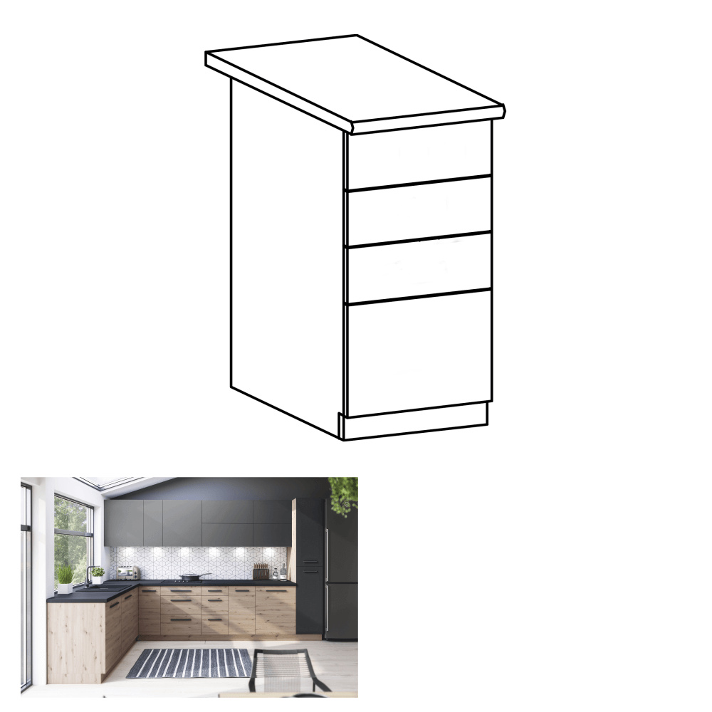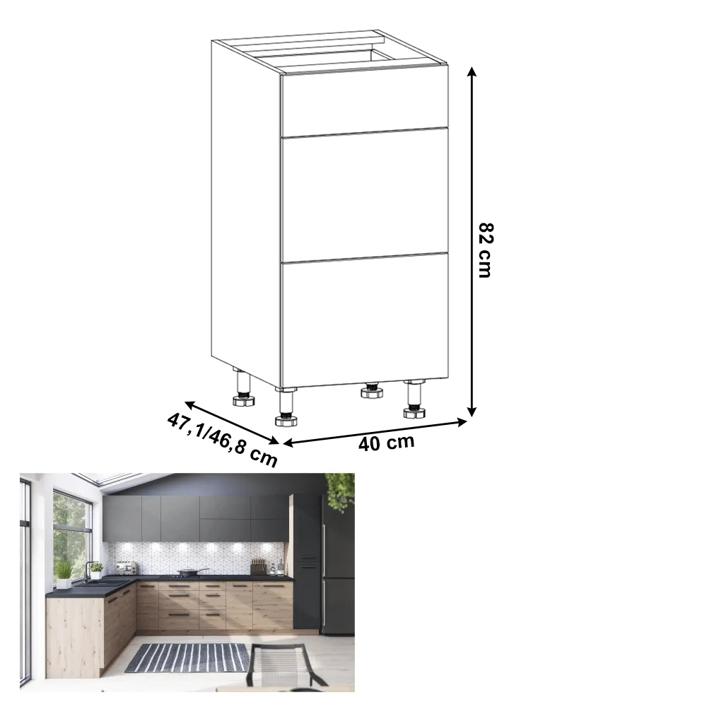 Materiál: DTD laminovaná Barva: dub artisan Rozměry (ŠxHxV): 40x47,1/46,8x82 cm Tloušťka materiálu dvířka (dub artisan): 1,5 cm Tloušťka materiálu dvířka (šedá MDF): 1,8 cm Bez pracovní desky Bez spodní lišty Otevírání PUSH OPEN Dodávané v demontu Cena sektorových skříněk je uváděna bez pracovní desky a spodní lišty. Cena za pracovní desku dub artisan je 1.690 Kč / bm - tloušťka 38 mm, cena za pracovní desku černý vulkán je 1.990 Kč / bm - tloušťka 38 mm. Možnost dokoupení spodní lišty dub artisan v rozměru 1 m za cenu 280 Kč nebo v rozměru 2 m za cenu 560 Kč a ukončení na sokl o hloubce 47 cm nebo 58 cm za 140 Kč. Ke každé dolní skříňce je nutné doobjednat 2 ks úchytů na sokl cena 40 Kč / 2 ks. U skříněk D60S3 a D40S3 je třeba si vybrat skříňku s úchytkou nebo systémem Push Open.