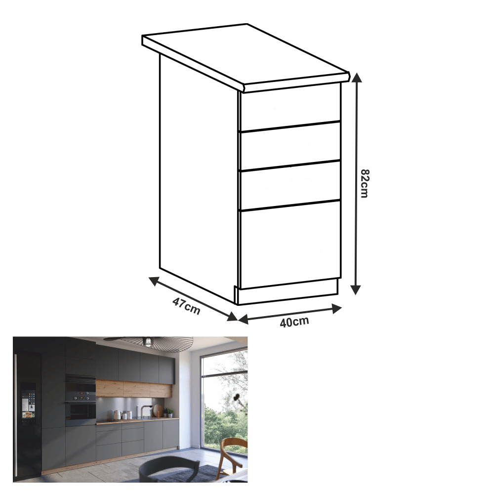 Materiál: DTD laminovaná Barva: dub artisan / šedý mat Rozměry (ŠxHxV): 40x47,1/46,8x82 cm Tloušťka materiálu dvířka (dub artisan): 1,5 cm Tloušťka materiálu dvířka (šedá MDF): 1,8 cm Otevírání PUSH OPEN Bez pracovní desky Bez spodní lišty Barva vnitřní strany: bílá Dodávané v demontu Cena sektorových skříněk je uváděna bez pracovní desky a spodní lišty. Cena za pracovní desku dub artisan je 1.690 Kč / bm - tloušťka 38 mm, cena za pracovní desku černý vulkán je 1.990 Kč / bm - tloušťka 38 mm. Možnost dokoupení spodní lišty dub artisan v rozměru 1 m za cenu 280 Kč nebo v rozměru 2 m za cenu 560 Kč a ukončení na sokl o hloubce 47 cm nebo 58 cm za 140 Kč. Ke každé dolní skříňce je nutné doobjednat 2 ks úchytů na sokl cena 40 Kč / 2 ks. U skříněk D60S3 a D40S3 je třeba si vybrat skříňku s úchytkou nebo systémem Push Open.
