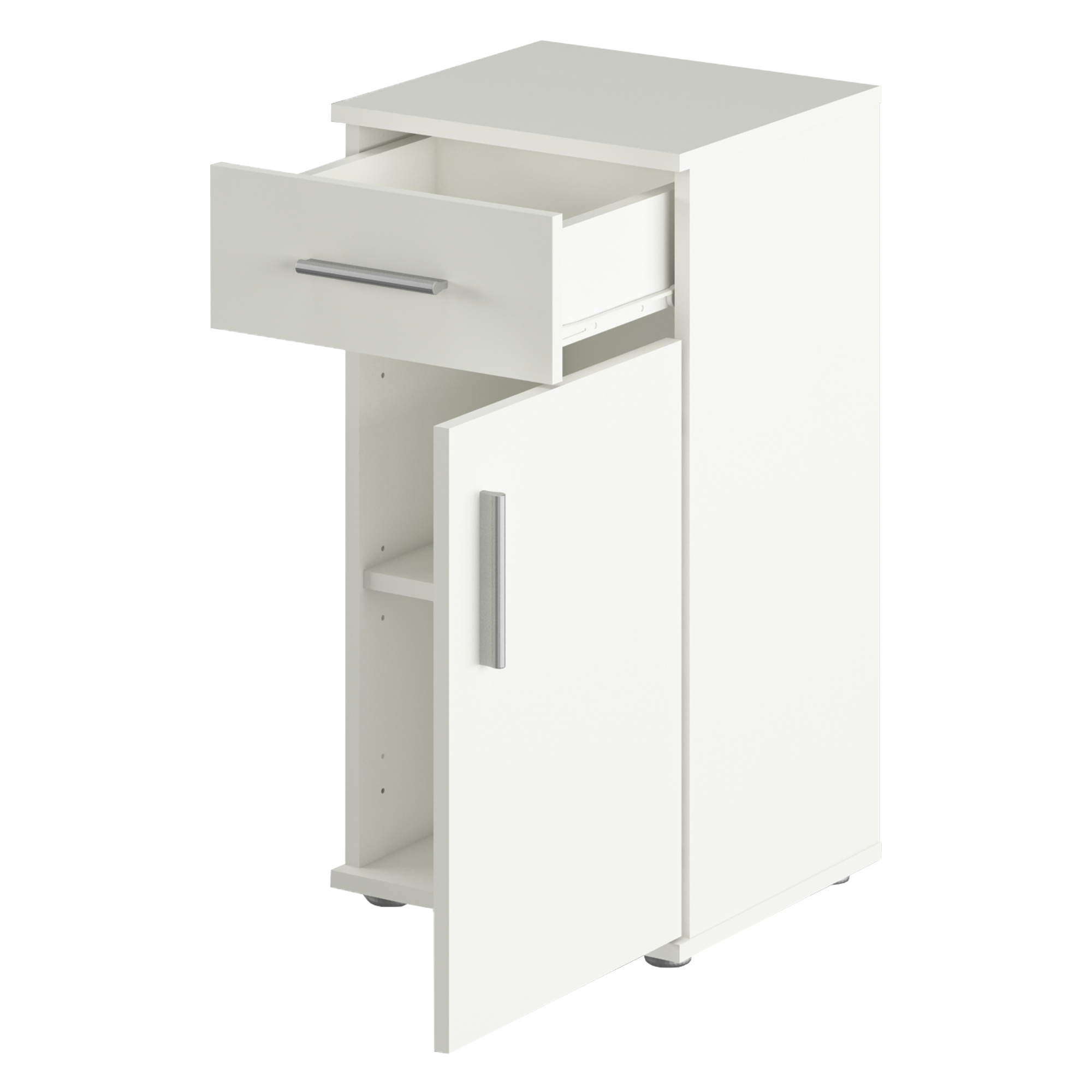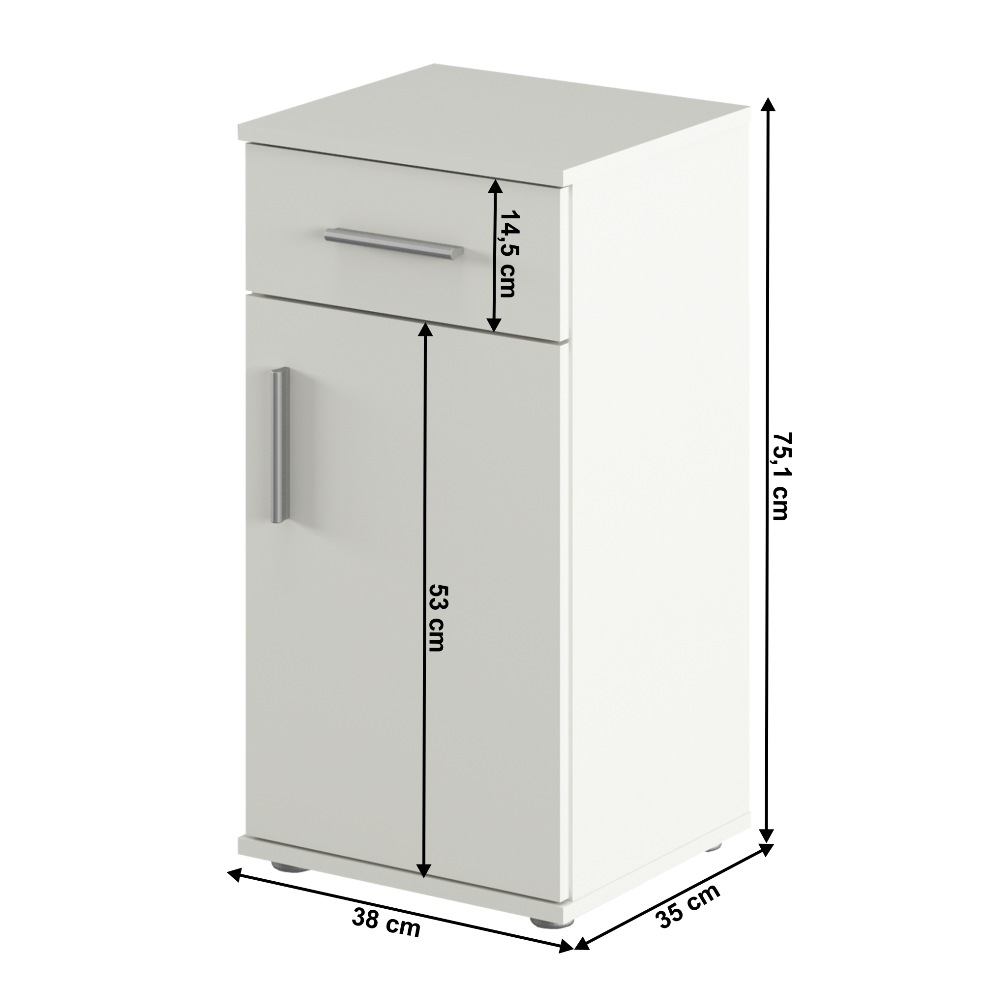 Materiál: DTD laminovaná Barva: matná bílá Rozměry (ŠxHxV): 38x35x75,1 cm Tloušťka materiálu: 1,6 cm Plastové úchytky Barva úchytek: šedá Plastové kluzáky Barva kluzáků: šedá Výška kluzáků: 1,6 cm 1-dveřová 1 police Výška police: 53 cm 1 šuplík Výška šuplíku: 14,5 cm Univerzální Moderní design Dodáváno v demontu