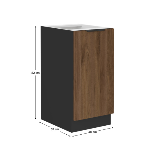 Materiál: laminovaná DTD Barva dvířek: ořech okapi Barva korpusu: černý mat Rozměry (ŠxHxV): 40x52x82 cm Tloušťka materiálu: 1,6 cm S dvířky Policová S úchytkou Barva úchytky: aluminiová Bez pracovní desky S dolní lištou/soklem Systém tichého zavírání dvířek Moderní design Možnost dokoupit univerzální dřez LAY ON Dodáváno v demontu Spodní sektorové skříňky jsou dodávány včetně dolní lišty (sokla), bez pracovní desky. Pracovní desku o tloušťce 3,8 cm si můžete doobjednat v provedení marmur roma za cenu 1.650 Kč/bm.