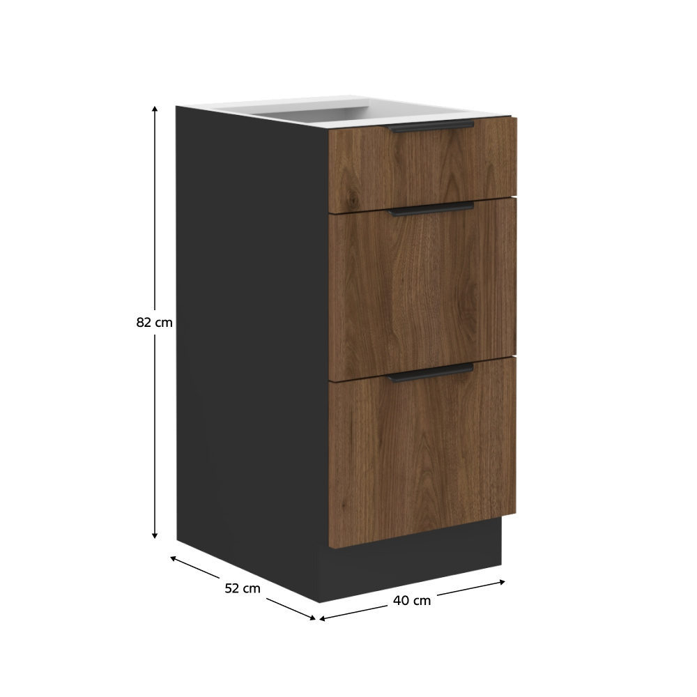 Materiál: laminovaná DTD Barva dvířek: ořech okapi Barva korpusu: černý mat Rozměry (ŠxHxV): 40x52x82 cm Tloušťka materiálu: 1,6 cm 3 šuplíky S úchytkou Barva úchytky: aluminiová Bez pracovní desky S dolní lištou/soklem Moderní design Šuplík typu PREMIUM-BOX s ocelovými bočnicemi Systém tichého dorazu zásuvek Možnost dokoupit univerzální dřez LAY ON Dodáváno v demontu Spodní sektorové skříňky jsou dodávány včetně dolní lišty (sokla), bez pracovní desky. Pracovní desku o tloušťce 3,8 cm si můžete doobjednat v provedení marmur roma za cenu 1.650 Kč/bm.