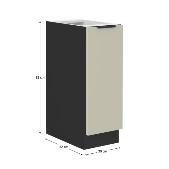 Materiál: laminovaná DTD Barva dvířek: cashmere/kašmír Barva korpus: černý mat Rozměry (ŠxHxV): 30x52x82 cm Tloušťka materiálu: 1,6 cm 1 dvířka S úchytkou Barva úchytky: aluminiová S dolní lištou/soklem S výsuvným košem Systém tichého dorazu dvířek Moderní design Možnost dokoupit univerzální dřez LAY ON Dodáváno v demontu Spodní sektorové skříňky jsou dodávány včetně dolní lišty (sokla), bez pracovní desky. Pracovní desku o tloušťce 3,8 cm si můžete doobjednat v provedení marmur roma za cenu 1.650 Kč/bm.