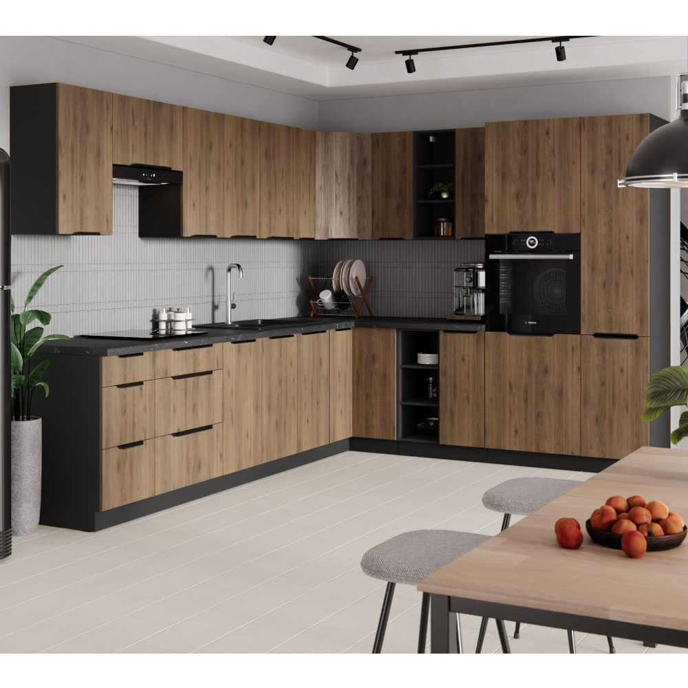 Materiál: laminovaná DTD Barva dvířek: ořech okapi Barva korpusu: černý mat Rozměry (ŠxHxV): 30x52x82 cm Tloušťka materiálu: 1,6 cm S úchytkou Barva úchytky: aluminiová S dolní lištou/soklem Moderní design Možnost dokoupit univerzální dřez LAY ON Dodáváno v demontu Spodní sektorové skříňky jsou dodávány včetně dolní lišty (sokla), bez pracovní desky. Pracovní desku o tloušťce 3,8 cm si můžete doobjednat v provedení marmur roma za cenu 1.890 Kč/bm.