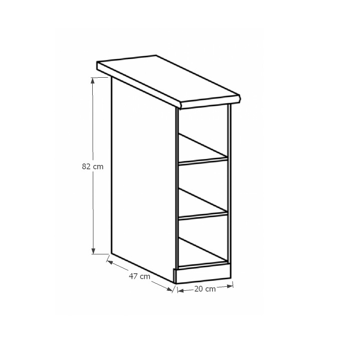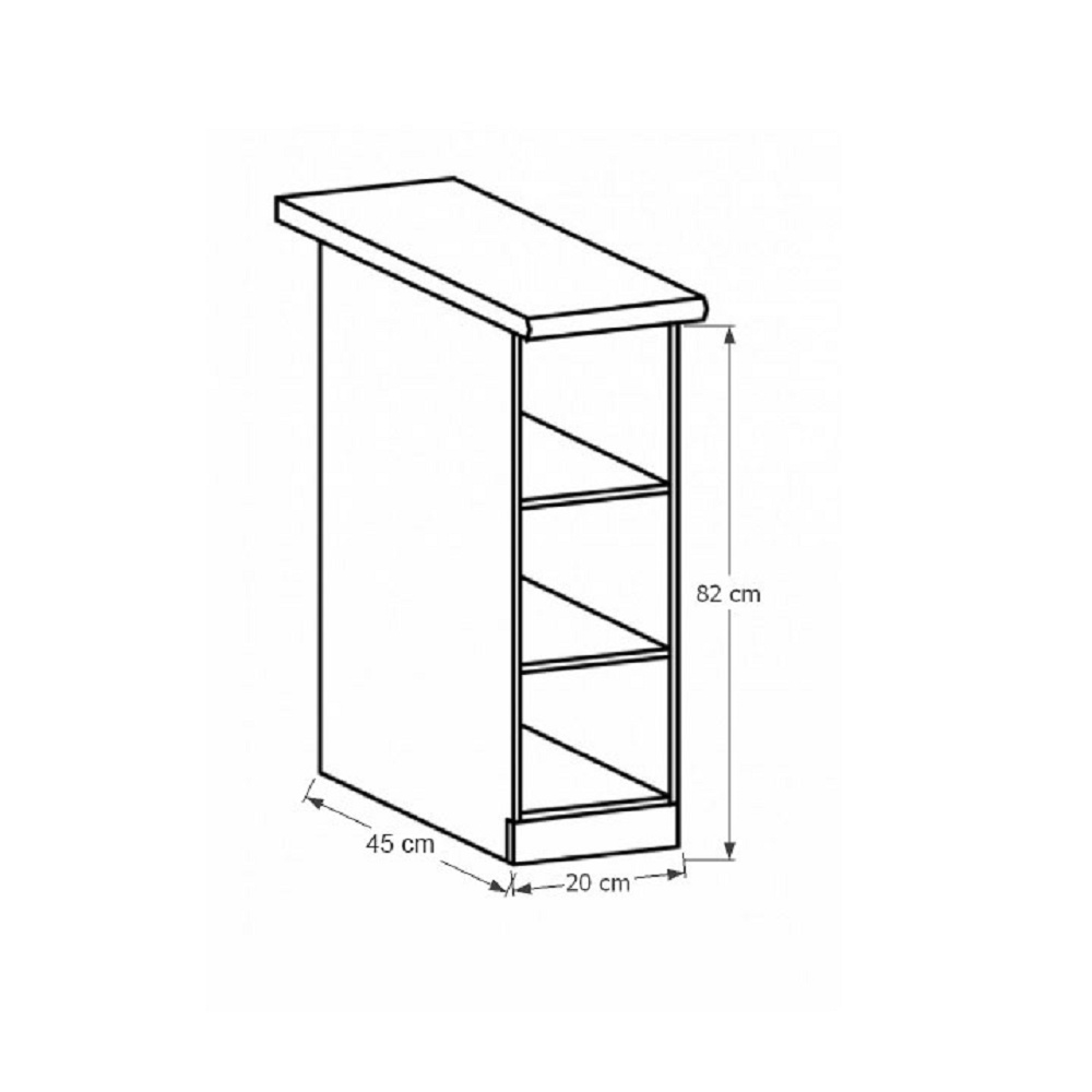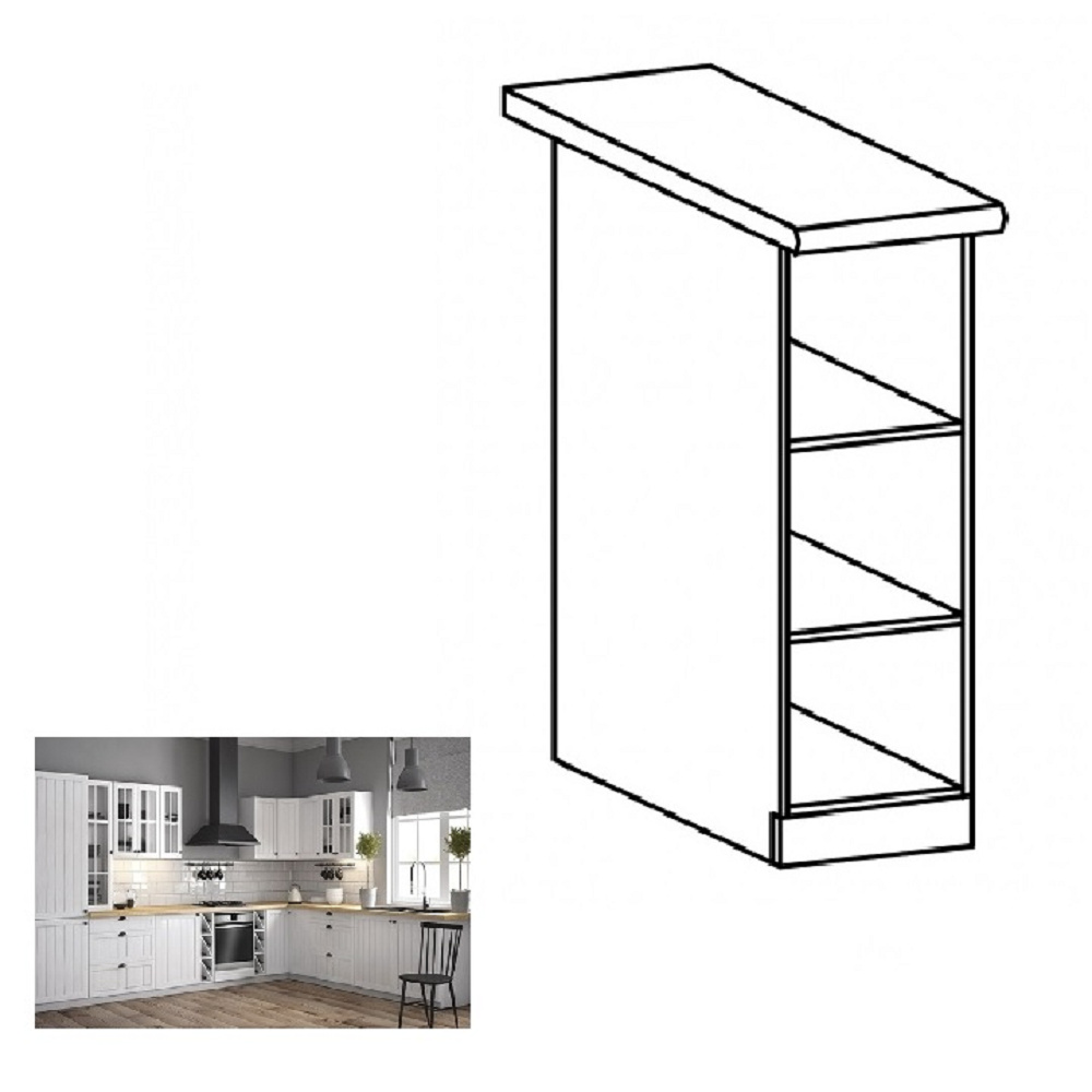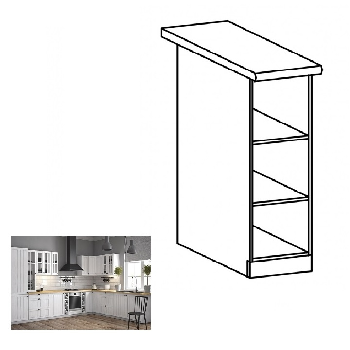 Spodní skříňka se dvěma policemi ke kuchyni Provance Provedení: DTD laminovaná Barva: bílý Rozměry (ŠxHxV): 20x45x82 cm Tloušťka materiálu: 15 mm Spodní skříňky jsou dodávány bez pracovní desky. Pracovní deska v tloušťce 3 cm. Ke spodním skříňkám je třeba doobjednat sokl. Ke každé spodní skříňce, kromě dřezové D25PZ, je třeba doobjednat ještě 2 kusy úchytů na sokl. Cena za pracovní desku dub lancelot je 1.890, - Kč za bm- tloušťka je 38 mm, cena za spodní lištu je 390, - Kč za bm. Cena ukončení na sokl s hloubkou 47 cm nebo 58 cm je 210 Kč. Ke každé dolní skříňce, kromě D25PZ, je třeba doobjednat 2 ks úchytek na sokl - cena 40, - Kč / 2Ks.