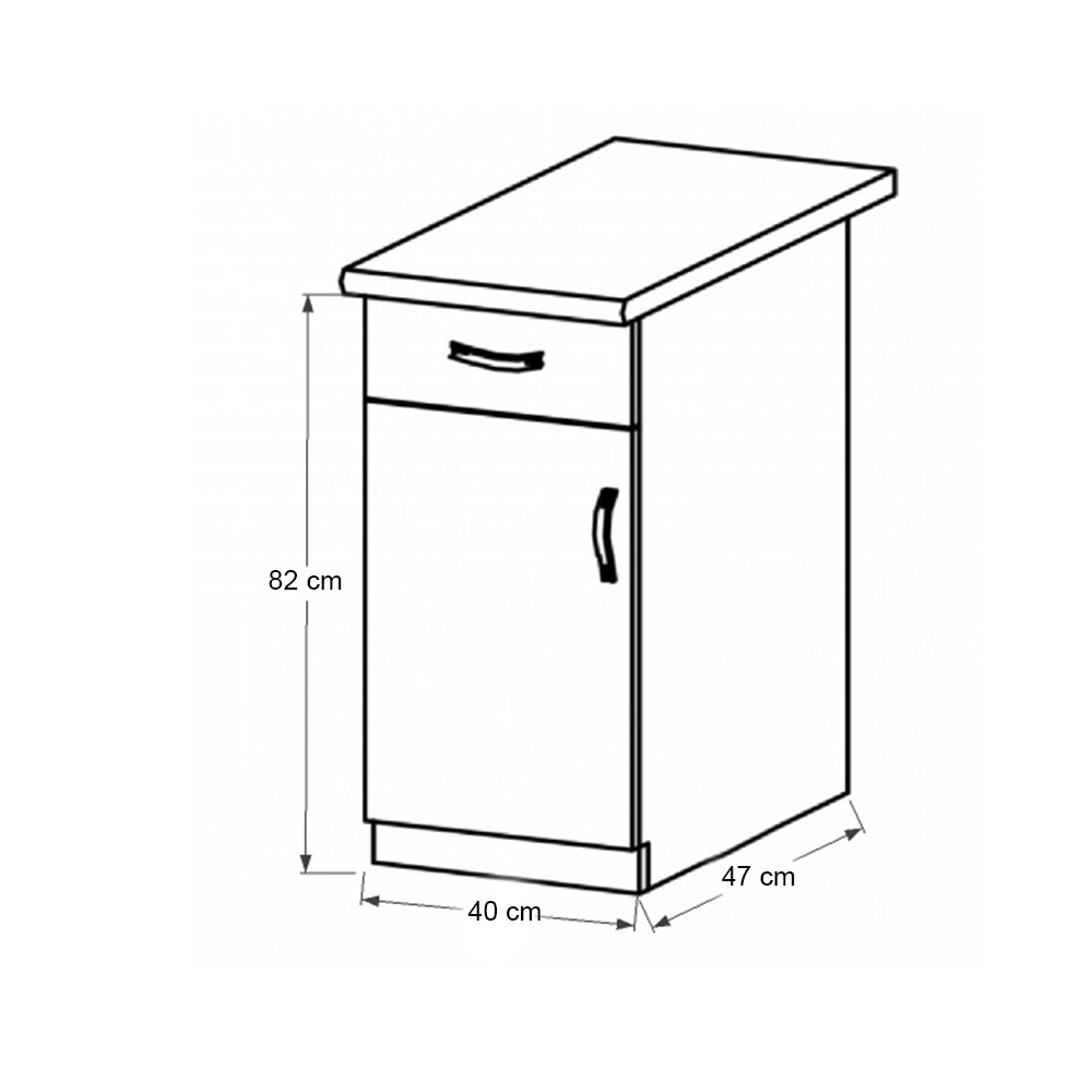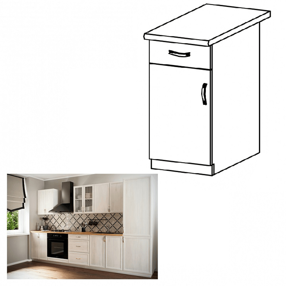 Spodní skříňka s dvířky a šuplíkem, ke kuchyni PROVANCE Provedení: DTD laminovaná / MDF Barva: bílá / sosna andersen Rozměry (ŠxHxV): 40x47x82 cm Tloušťka materiálu: 15 mm Systém tichého zavírání dvířek levé provedení Spodní skříňky jsou dodávány bez pracovní desky. Pracovní deska v tloušťce 3 cm. Ke spodním skříňkám je třeba doobjednat sokl. Ke každé spodní skříňce, kromě dřezové D25PZ, je třeba doobjednat ještě 2 kusy úchytů na sokl. Cena za pracovní desku dub lancelot je 1.690, - Kč za bm- tloušťka je 38 mm, cena za spodní lištu je 390, - Kč za bm. Cena ukončení na sokl s hloubkou 47 cm nebo 58 cm je 210 Kč. Ke každé dolní skříňce, kromě D25PZ, je třeba doobjednat 2 ks úchytek na sokl - cena 40, - Kč / 2Ks.