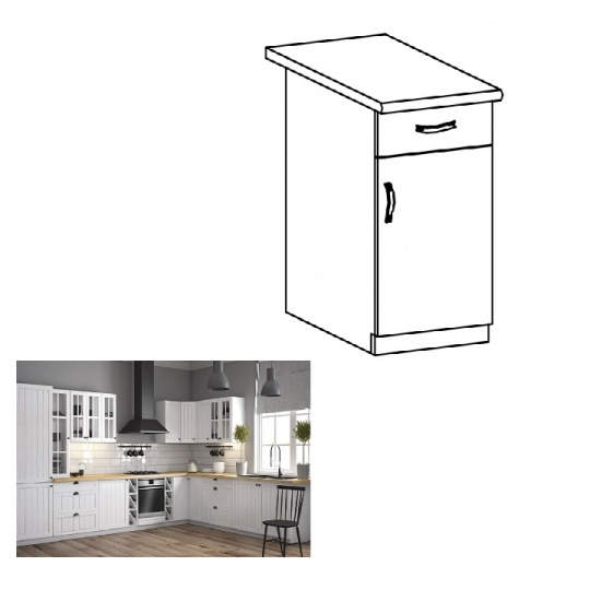 Spodní skříňka s dvířky a šuplíkem, ke kuchyni PROVANCE Provedení: DTD laminovaná / MDF Barva: bílá / sosna andersen Rozměry (ŠxHxV): 40x47x82 cm Tloušťka materiálu: 15 mm Systém tichého zavírání dvířek levé provedení Spodní skříňky jsou dodávány bez pracovní desky. Pracovní deska v tloušťce 3 cm. Ke spodním skříňkám je třeba doobjednat sokl. Ke každé spodní skříňce, kromě dřezové D25PZ, je třeba doobjednat ještě 2 kusy úchytů na sokl. Cena za pracovní desku dub lancelot je 1.690, - Kč za bm- tloušťka je 38 mm, cena za spodní lištu je 390, - Kč za bm. Cena ukončení na sokl s hloubkou 47 cm nebo 58 cm je 140 Kč. Ke každé dolní skříňce, kromě D25PZ, je třeba doobjednat 2 ks úchytek na sokl - cena 30, - Kč / 2Ks.