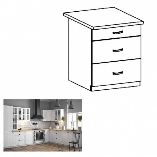 Spodní skříňka se třemi šuplíky ke kuchyni PROVANCE Provedení: DTD laminovaná / MDF Barva: bílá / sosna andersen Rozměry (ŠxHxV): 60x47x82 cm Tloušťka materiálu: 15 mm Spodní skříňky jsou dodávány bez pracovní desky. Pracovní deska v tloušťce 3 cm. Ke spodním skříňkám je třeba doobjednat sokl. Ke každé spodní skříňce, kromě dřezové D25PZ, je třeba doobjednat ještě 2 kusy úchytů na sokl. Cena za pracovní desku dub lancelot je 1.690, - Kč za bm- tloušťka je 38 mm, cena za spodní lištu je 390, - Kč za bm. Cena ukončení na sokl s hloubkou 47 cm nebo 58 cm je 140 Kč. Ke každé dolní skříňce, kromě D25PZ, je třeba doobjednat 2 ks úchytek na sokl - cena 30, - Kč / 2Ks.