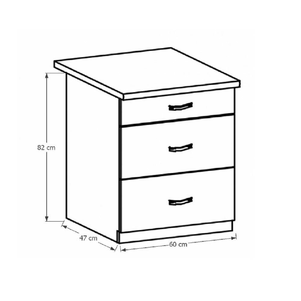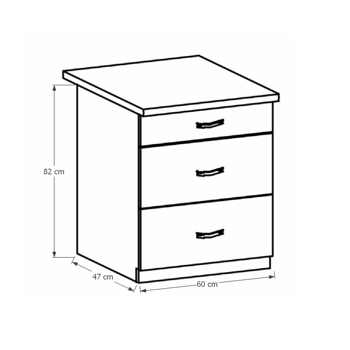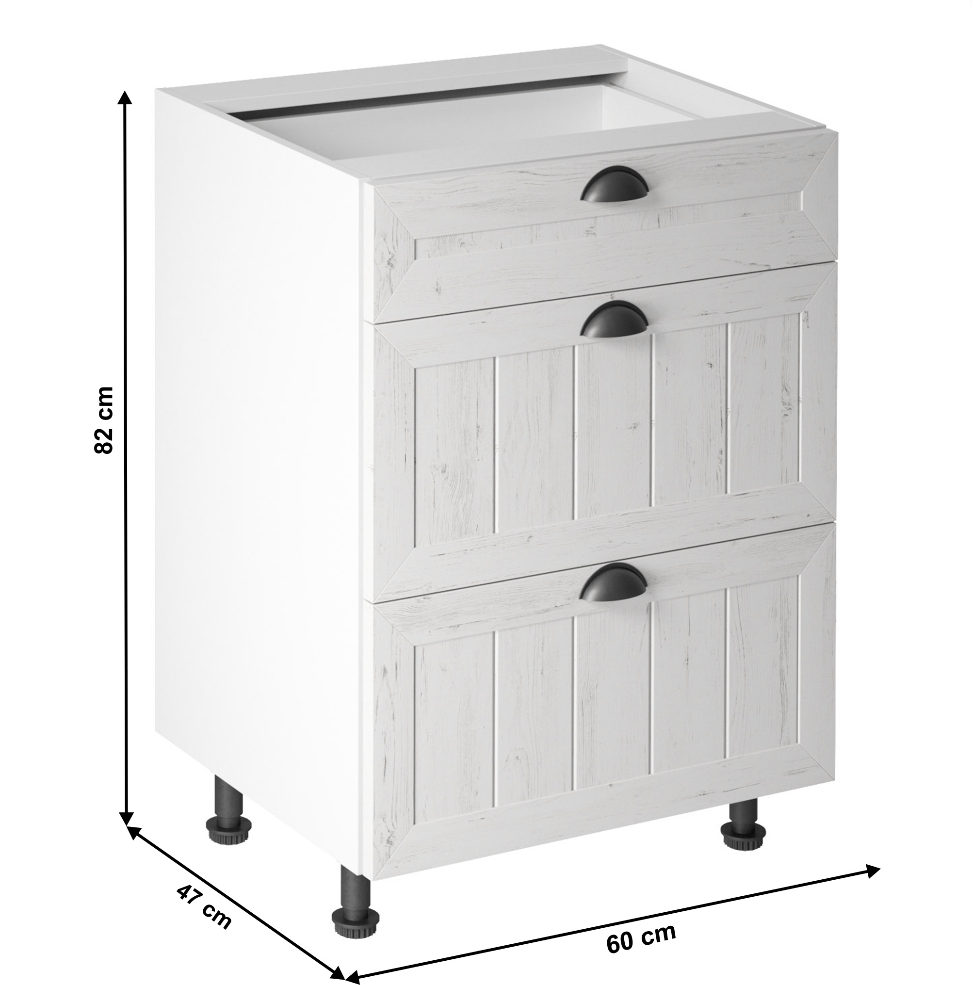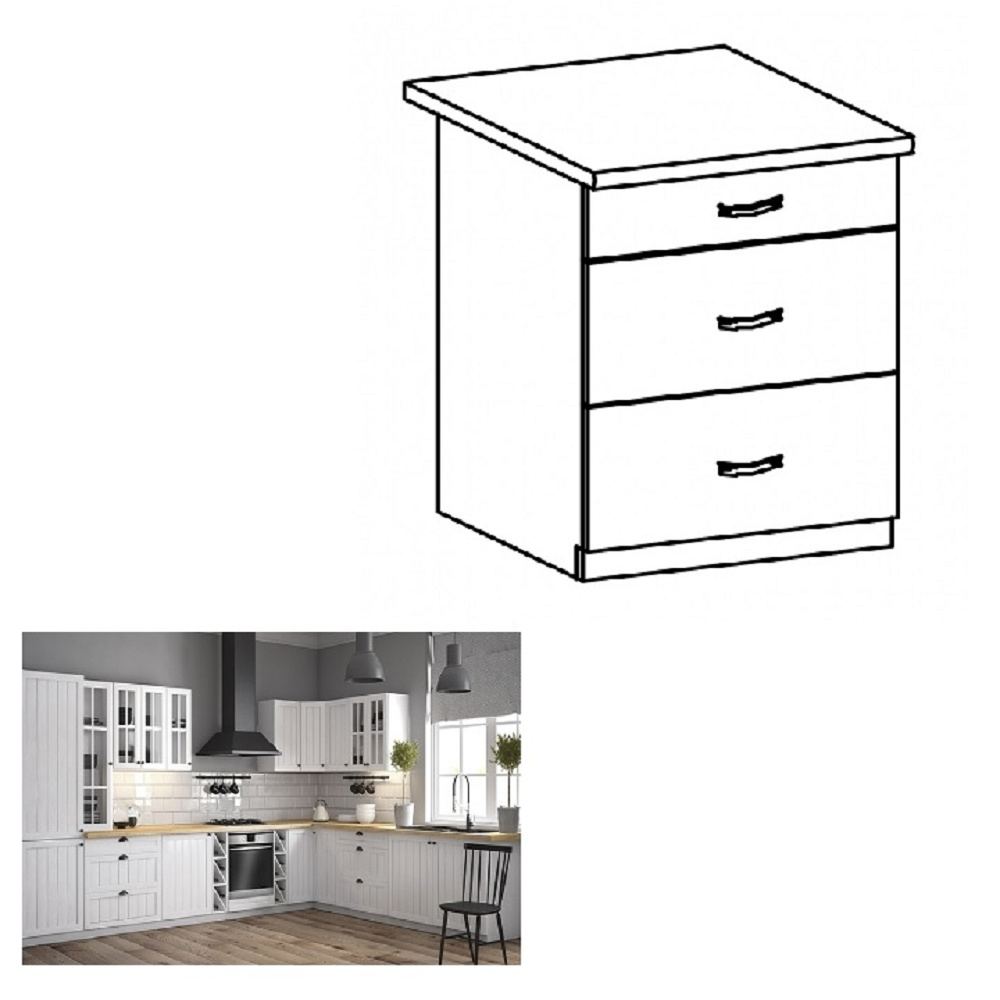 Spodní skříňka se třemi šuplíky ke kuchyni PROVANCE Provedení: DTD laminovaná / MDF Barva: bílá / sosna andersen Rozměry (ŠxHxV): 60x47x82 cm Tloušťka materiálu: 15 mm Spodní skříňky jsou dodávány bez pracovní desky. Pracovní deska v tloušťce 3 cm. Ke spodním skříňkám je třeba doobjednat sokl. Ke každé spodní skříňce, kromě dřezové D25PZ, je třeba doobjednat ještě 2 kusy úchytů na sokl. Cena za pracovní desku dub lancelot je 1.890, - Kč za bm- tloušťka je 38 mm, cena za spodní lištu je 390, - Kč za bm. Cena ukončení na sokl s hloubkou 47 cm nebo 58 cm je 210 Kč. Ke každé dolní skříňce, kromě D25PZ, je třeba doobjednat 2 ks úchytek na sokl - cena 40, - Kč / 2Ks.