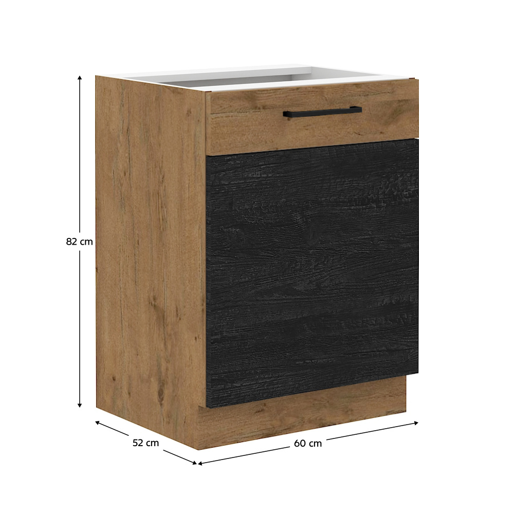 Spodní skříňka VEGA 60 D 1F BB Materiál: DTD laminovaná Barva: šedá matná / dub lancelot Rozměry (ŠxHxV): 60x52x82 cm Skříňka bez pracovní desky Systém tichého zavírání dvířek Včetně spodní lišty Dodávané v demontu Spodní skříňky jsou dodávány včetně dolní lišty, bez pracovní desky. Možnost dokoupit pracovní desku dub lancelot v ceně: 1590 Kč/bm. Možnost dokoupit univerzální L / P dřez LAY ON.