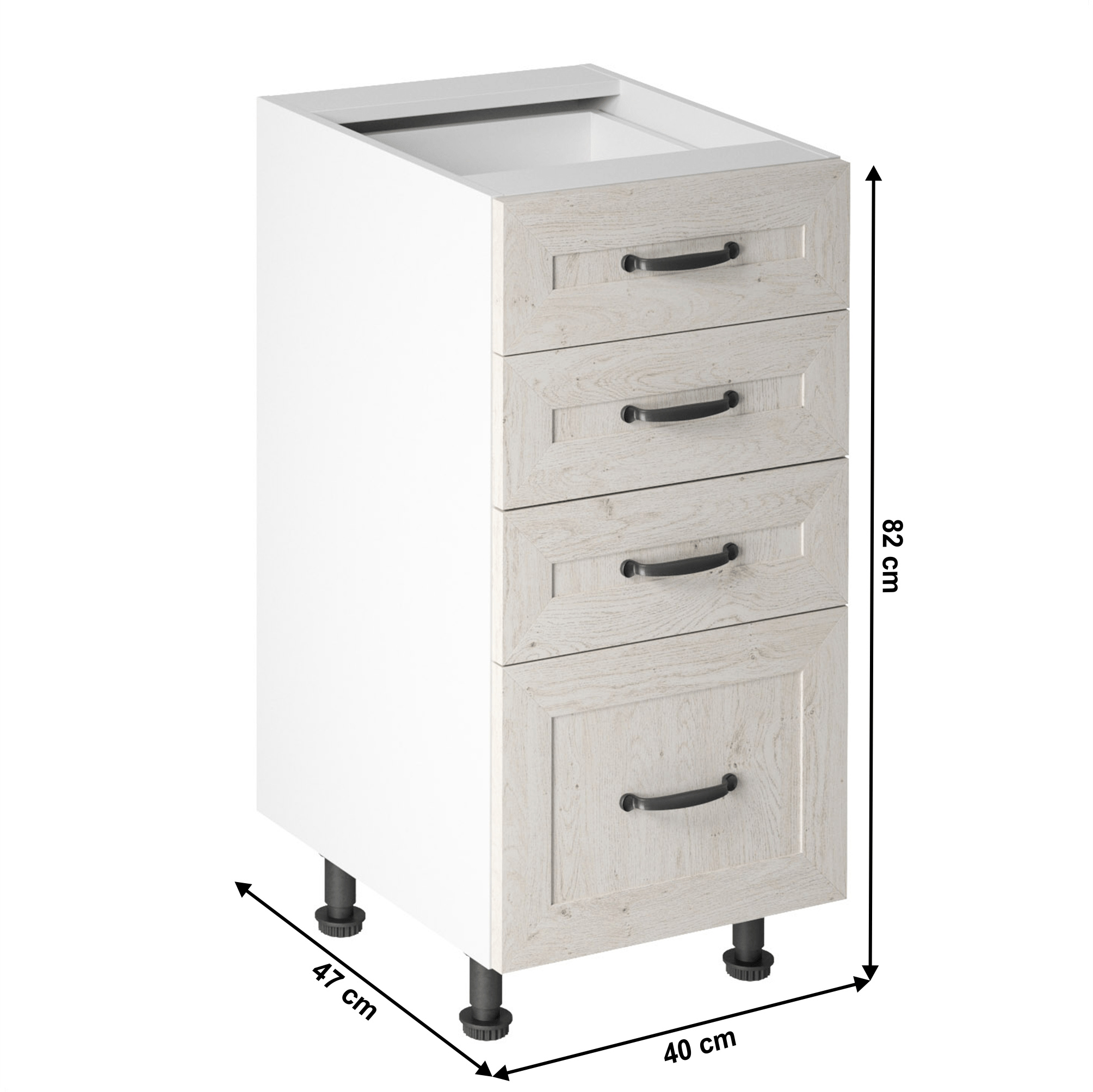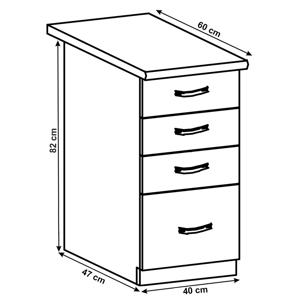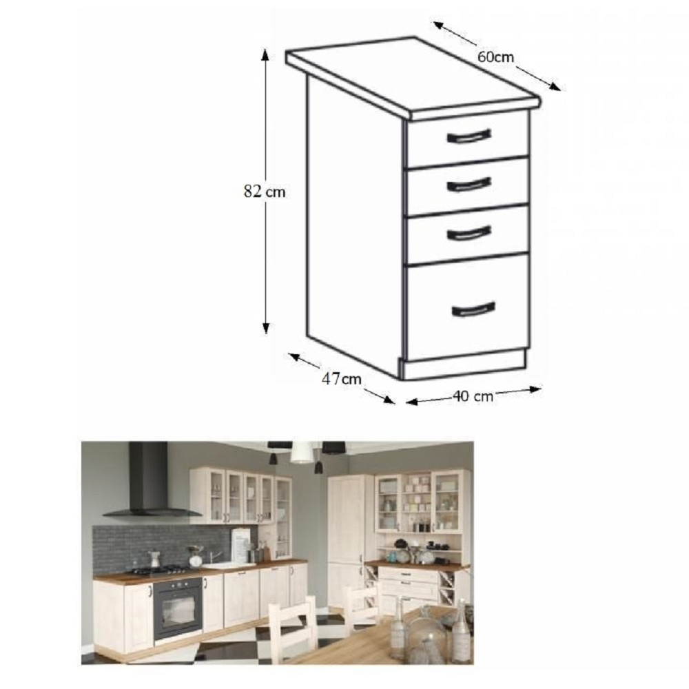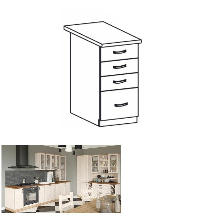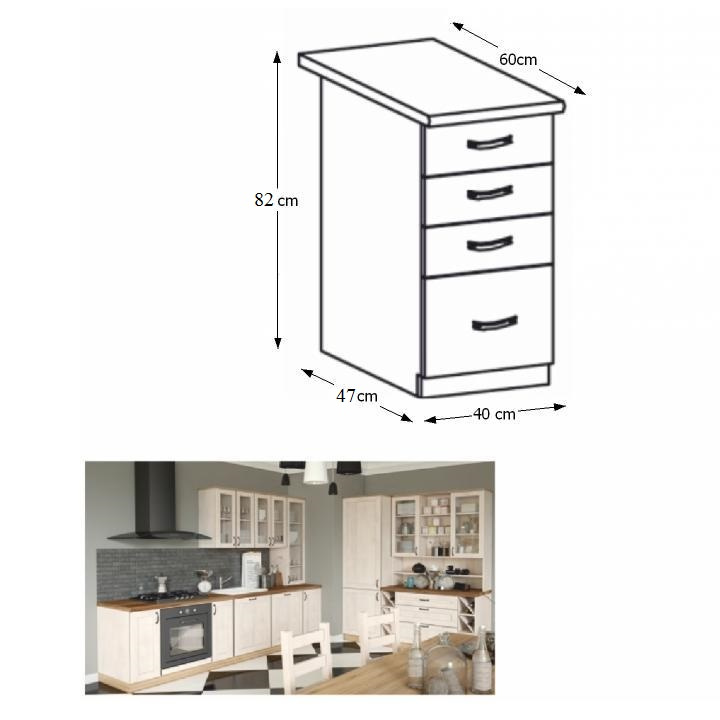 Spodní šuplíková skříňka, ROYAL D40S4 Materiál: korpus je vyroben z kvalitní laminované dřevotřísky Barva: bílá/sosna skandinávska Rozměry ŠxHxV: 40x47x82 cm Tloušťka materiálu: 15 mm Dodávané v demontu. Spodní skříňky ke kuchyni ROYAL jsou dodávány bez pracovní desky a bez soklu. Pracovní desku Dub Porterhouse tmavý lze doobjednat v tloušťce 3,8 cm v ceně 1690 Kč/1 bm. Ke každé dolní skříňce, kromě rohových skříněk D25PZ, je třeba doobjednat i sokel v provedení dub divoký v ceně 270 Kč/1 bm a 2 kusy úchytů na sokl v ceně 30 Kč/2 ks. Ke spodním skříňkám máte možnost dokoupit také ukončení na sokl o hloubce 47 cm a 56 cm za 140 Kč. Objednávku vepište do poznámky v objednávkovém formuláři.