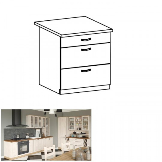 Spodní šuplíková skříňka, ROYAL D80S3 Materiál: korpus je vyroben z kvalitní laminované dřevotřísky Barva: bílá/sosna skandinávska Rozměry ŠxHxV: 80x47x82 cm Tloušťka materiálu: 15 mm Dodávané v demontu. Spodní skříňky ke kuchyni ROYAL jsou dodávány bez pracovní desky a bez soklu. Pracovní desku Dub Porterhouse tmavý lze doobjednat v tloušťce 3,8 cm v ceně 1690 Kč/1 bm. Ke každé dolní skříňce, kromě rohových skříněk D25PZ, je třeba doobjednat i sokel v provedení dub divoký v ceně 280 Kč/1 bm a 2 kusy úchytů na sokl v ceně 30 Kč/2 ks. Ke spodním skříňkám máte možnost dokoupit také ukončení na sokl o hloubce 47 cm a 56 cm za 140 Kč. Objednávku vepište do poznámky v objednávkovém formuláři.