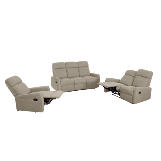 Materiál: látka/kov Oděruodolnost textilie podle testu Martindale: 20 000 oděrů Barva: šedohnědá Taupe Rozměry trojsedu (ŠxHxV): 184x89/128x98/102 cm Rozměry dvousedu (ŠxHxV): 127x89/128x98/102 cm Rozměry křesla (ŠxHxV): 71x89/128x98/102 cm Výška sedu: 46 cm Hloubka sedu: 51 cm Výška opěrky zad: 67 cm Výplň: PUR pěna 3-sed s funkcí polohování pravé a levé části 2-sed s funkcí polohování Křeslo je polohovací Mechanické polohování Podnož vysunete pomocí páčky Dřevěná konstrukce: eukalyptus Nosnost: 120 kg Dodáváno v demontu