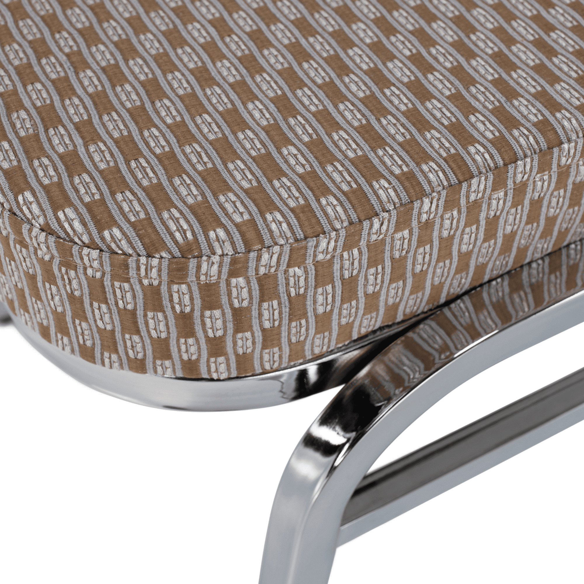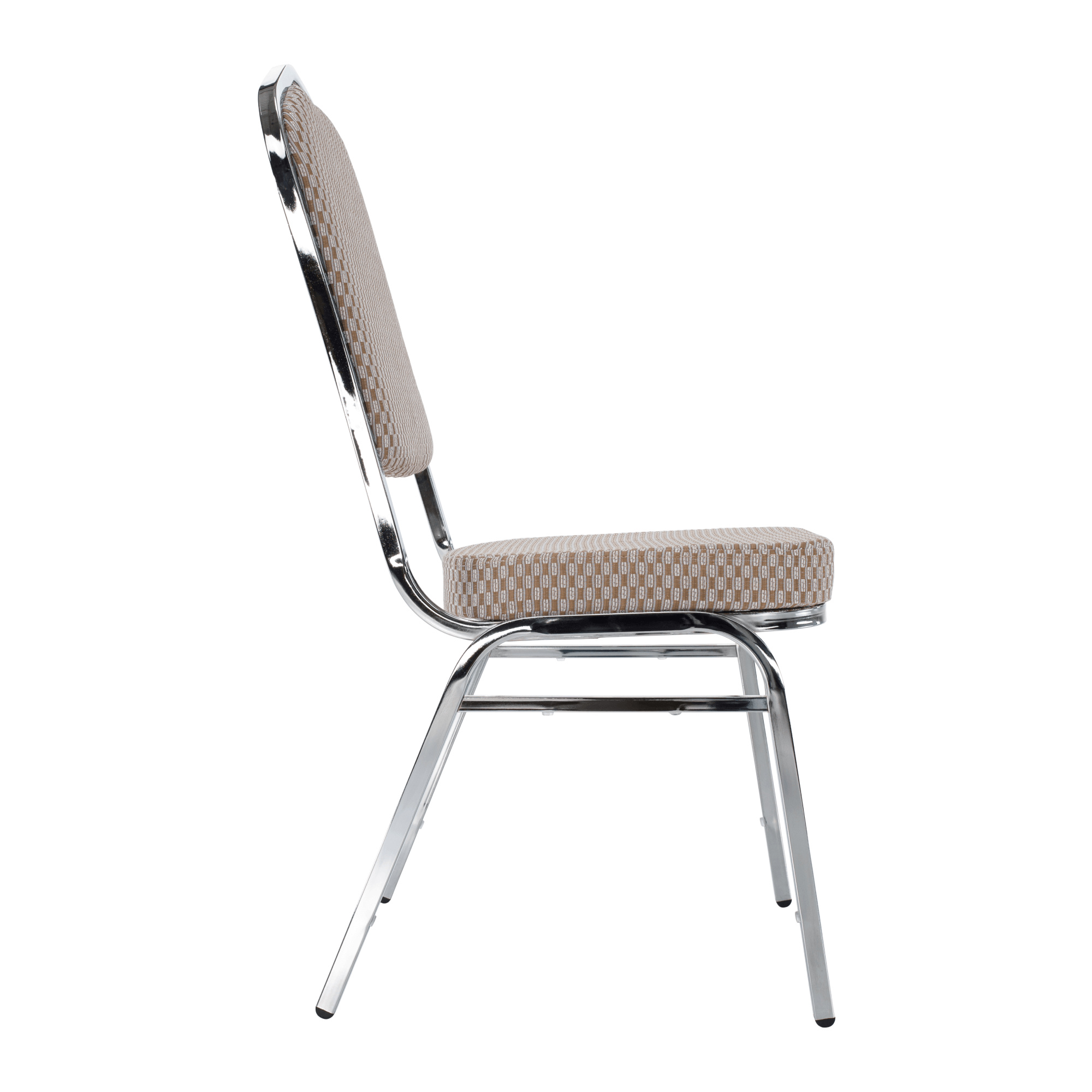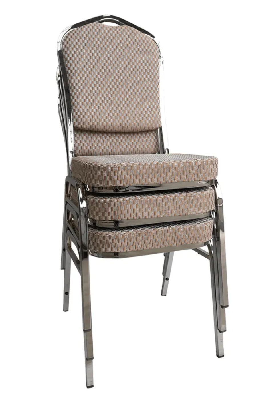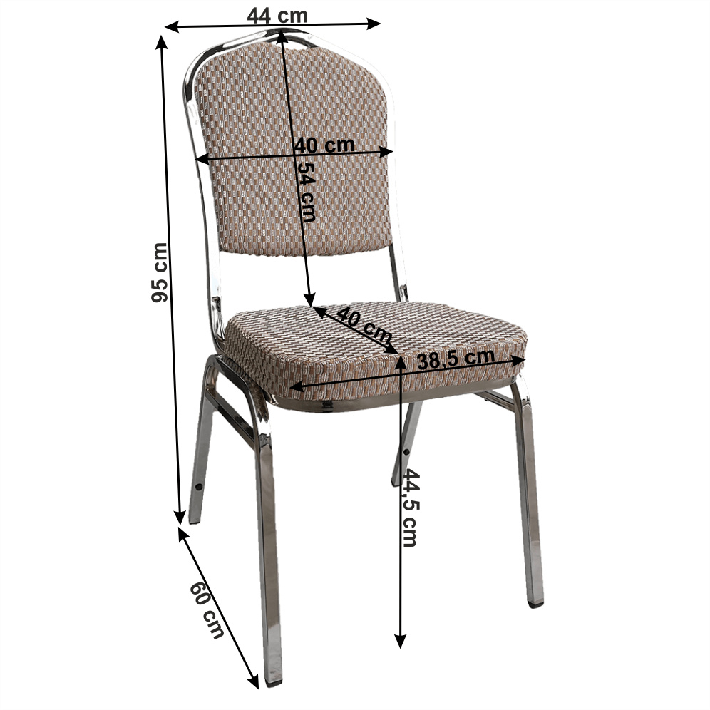 Materiál čalounění: látka Oděruodolnost textilie podle testu Martindale: 65 000 oděrek Barva čalounění: béžová / vzor Materiál nohy: kov Barva nohy: chrom Rozměry (ŠxHxV): 44x60x95 cm Výška sedu: 44,5 cm Hloubka sedu: 40 cm Šířka sedu: 38,5 cm Opěrka zad (ŠxV): 40x54 cm Nosnost: 130 kg stohovatelná Dodávaná v monte