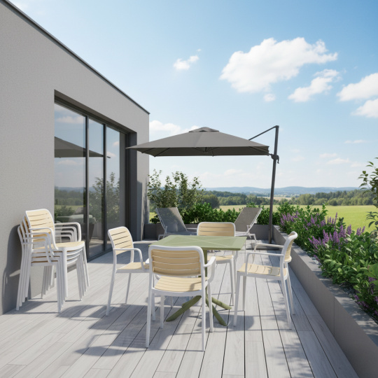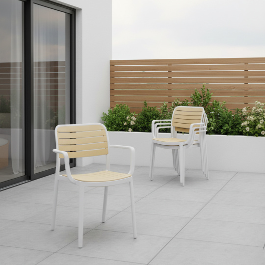 Materiál: plast Farba: biela/béžová Rozmery (ŠxHxV): 56,5x53x81 cm Výška sedu: 46,5 cm Hĺbka sedu: 43 cm Šírka sedu: 41 cm Výška chrbta: 38,5 cm Šírka chrbta: 43 cm Nosnosť: 100 kg Hmotnosť: 5,3 kg Stohovateľná Vhodná do interiéru aj exteriéru Dodávané v monte
