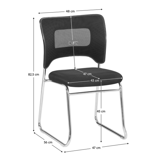 Materiál: síťovina/kov Oděruodolnost textilie podle testu Martindale: 90 000 oděrů Barva: černá/chrom Rozměry (ŠxHxV): 47x56x82,5 cm Výška sedu : 45 cm Hloubka sedu: 47 cm Šířka sedu: 43 cm Šířka zádové opěrky: 48 cm Výška zádové opěrky: 40 cm Nosnost: 100 kg Hmotnost: 5 kg Chromová podstava Stohovatelná Zasedací Dodáváno v demontu