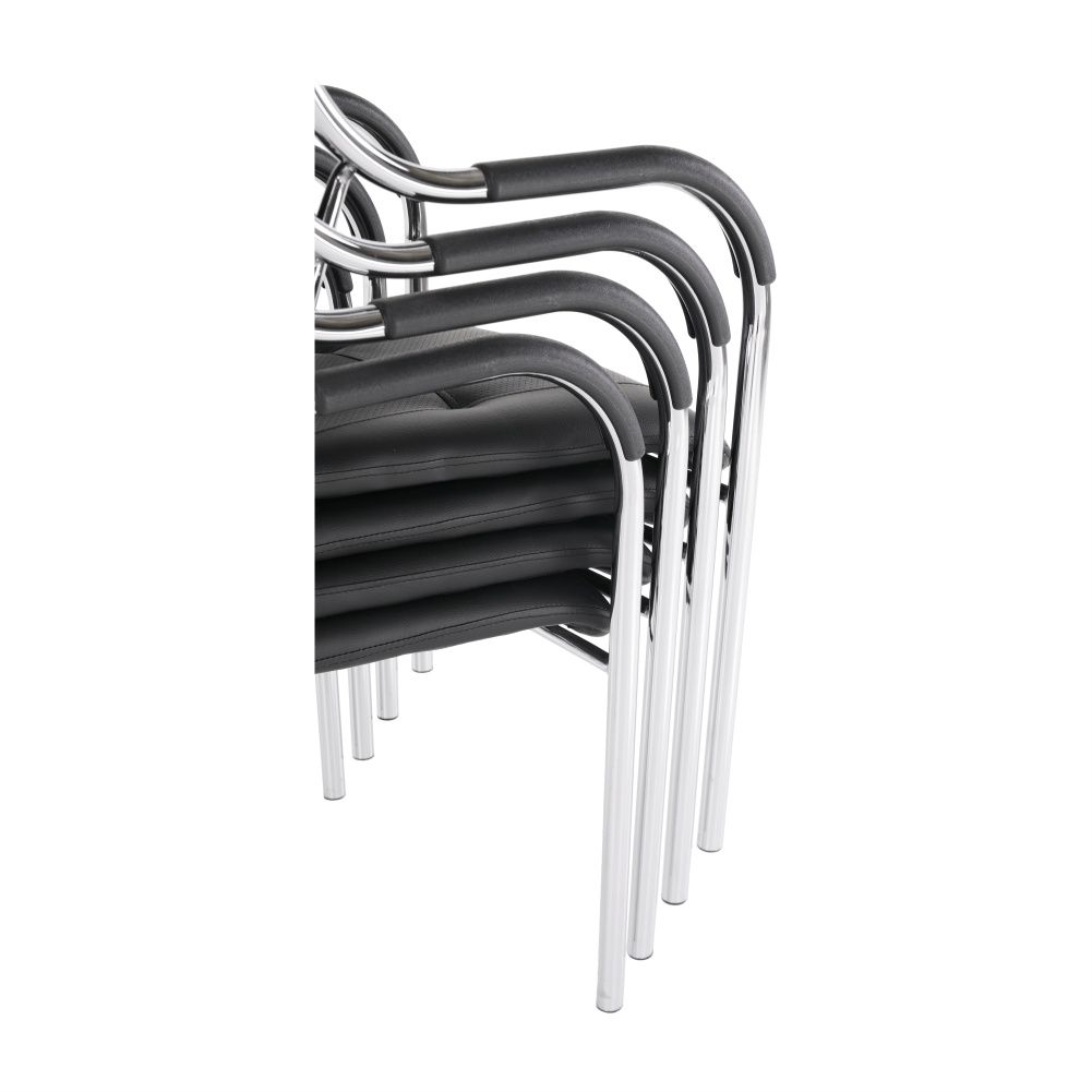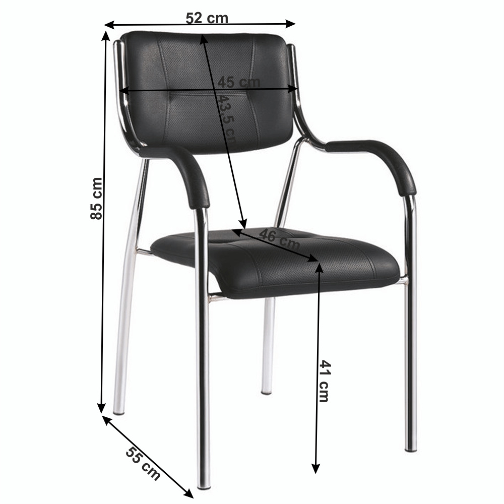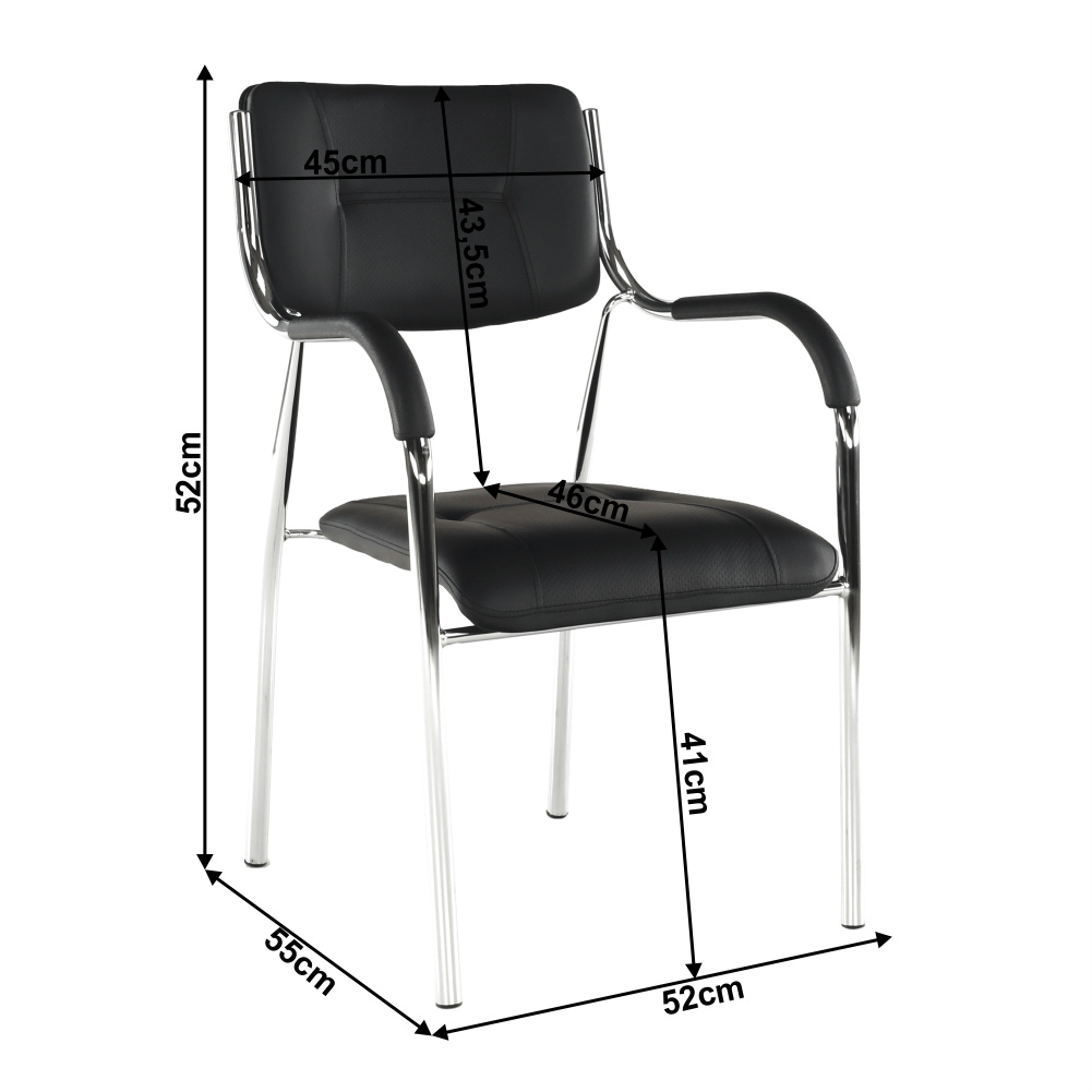 Oděruodolnost textilie podle testu Martindale: 100 000 oděrek Barva: černá / chrom Rozměry (ŠxHxV): 52x55x85 cm Výška sedu: 41 cm Hloubka sedu: 46 cm Šířka sedu: 43 cm Šířka zádové opěrky: 45 cm Výška zádové opěrky: 43,5 cm Výška od země po opěrku na ruce: 63,5 cm Nosnost: 110 kg Jeden stoh obsahuje Max. 8 ks židlí Výška stohu při 8 ks židlí je 120 cm Dodávané v monte