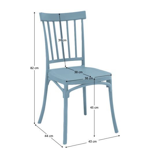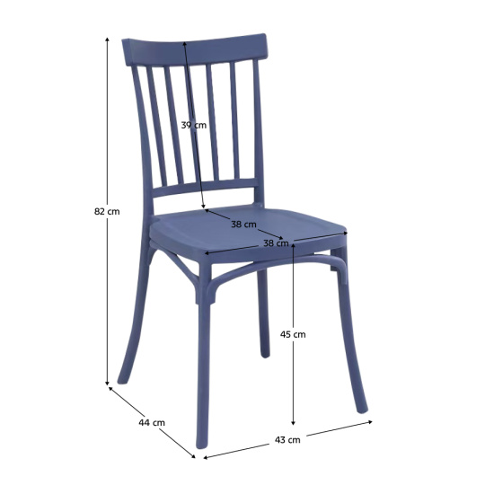 Materiál: plast Barva: modrá Rozměry (ŠxHxV): 43x51x83 cm Výška sedu: 45 cm Hloubka sedu: 38 cm Šířka sedu: 38 cm Výška zad: 39 cm Stohovatelná S UV filtrem Vhodná do interiéru a exteriéru Nosnost: 100 kg Dodáváno v monte